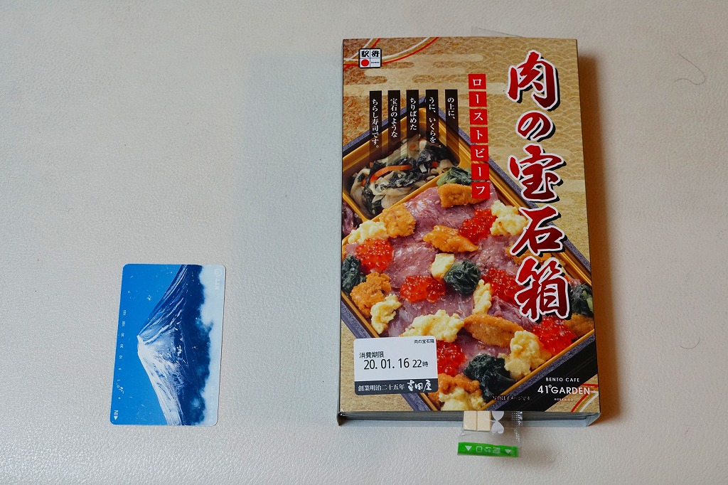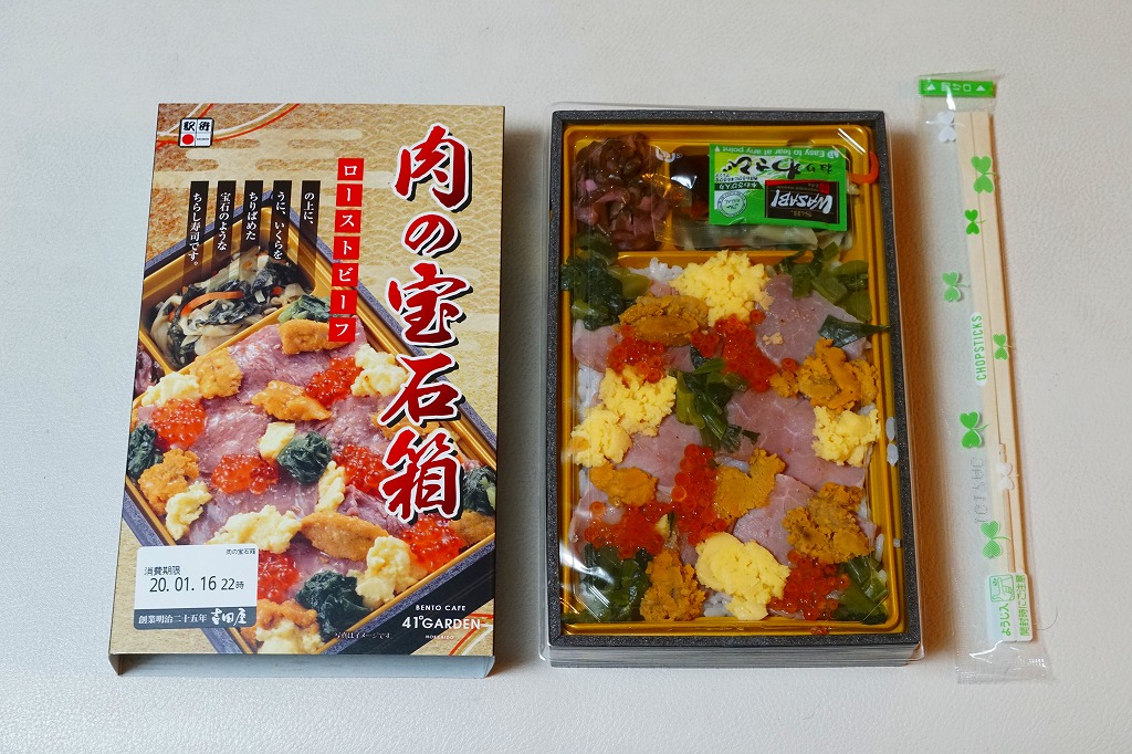 秋冬の駅弁大会シーズンに向けた、2019(令和元)年秋の新商品か。内容や宣伝文は、スリーブに写真付きでしっかり書かれており、「ローストビーフの上に、うに、いくらをちりばめた宝石のようなちらし寿司です。」ということで、酢飯の上にローストビーフ、蒸しウニ、スクランブルエッグ、いくら醤油漬、わさび菜をちりばめて、タケノコと野沢菜のおひたしと柴漬けを添える。きらびやかな、例えば小樽駅弁「海の輝き」のような見栄えのちらし寿司を、ローストビーフで作った不思議な味。2シーズンを売り、2021年の春頃に終売か。