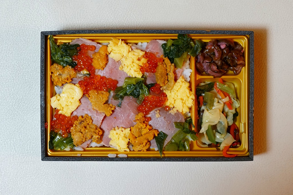 秋冬の駅弁大会シーズンに向けた、2018(平成30)年秋の新商品か。調製元の八戸駅弁にも使われる、漆塗り木箱を模して分厚く組み立てた厚紙製折箱に、茶飯を詰め、蒸しウニとイクラと玉子焼と野沢菜とガリで覆う。今回は駅弁売店での実演販売のものを買ったようで、調製元が日本レストランエンタプライズになっていた。3シーズンを売り、2021年の春頃に終売か。