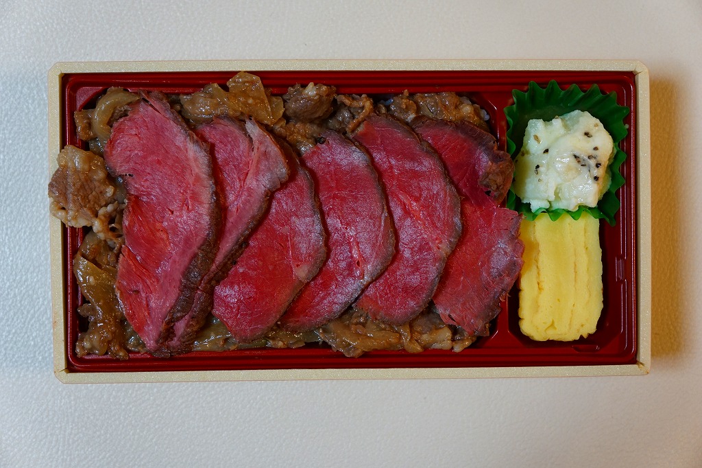 長方形の容器に白御飯を詰め、中央を赤黒いローストビーフで、周囲を甘い牛肉煮で覆い尽くし、玉子焼とポテトサラダとステーキソースを添える。千円代後半の実演販売に囲まれた、催事場での感覚のマヒを差し引いても、この駅弁なら値段相応のお肉と質と味がありそうな感じ。2シーズン分、1年ちょっとの販売か。