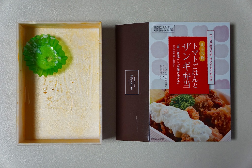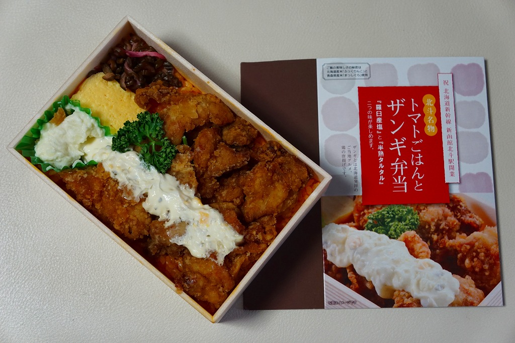 2016(平成28)年の夏までに発売か。「ザンギ」とは、唐揚げの北海道内での呼び名。駅弁の名前のとおり、長方形の容器にトマトごはんを敷き詰め、ザンギなる鶏唐揚でほぼ覆い、タルタルソースをかけてパセリで彩り、ポテトサラダ、玉子焼、柴漬けを添える。中身は少し異なるが東京駅の名物駅弁「チキン弁当」を思わせる、水っぽい飯とざらついた鶏唐揚が、見た目も発売時期も新しい駅弁なのに昔懐かしい感じ。発売翌年の京王百貨店の駅弁大会での輸送販売では大人気で、開店時でもなかなか買えなかった模様。2018年8月頃に終売。