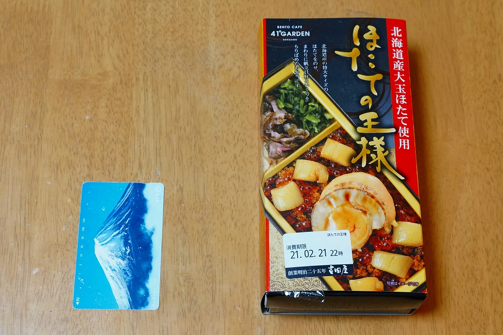 秋冬の駅弁大会シーズンに向けた、2020(令和2)年秋の新商品か。茶飯を海苔で覆い、ホタテ煮1個と貝柱を載せ、すき間をいくらととびっこで埋め、3種の漬物を添付する。ホタテが味を支配する。かつて岩手県に、御飯の上に銀河を描いた駅弁がいくつかあったが、ホタテやイクラなどが銀河に見え、それに似ているように見えた。2021−2022年シーズンで終売か。