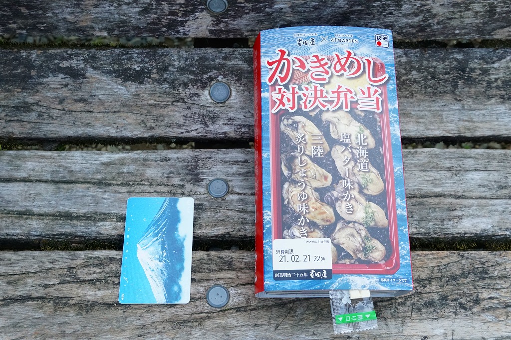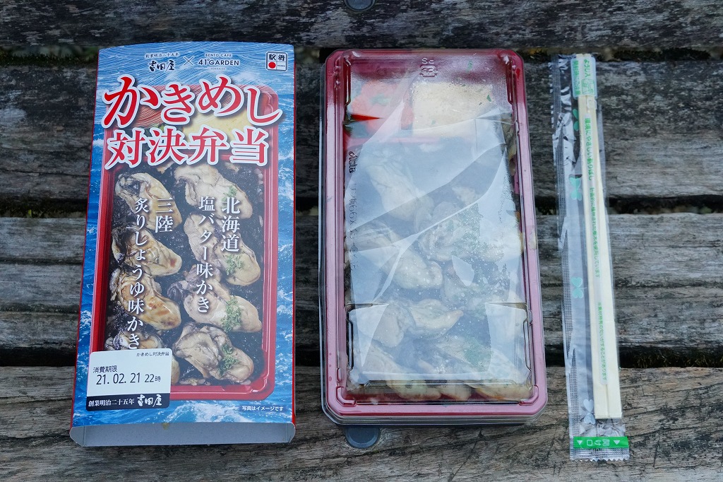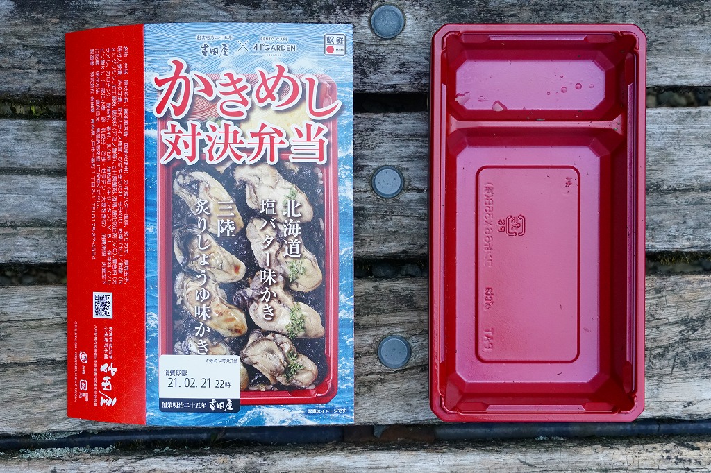 秋冬の駅弁大会シーズンに向けた、2020(令和2)年秋の新商品か。茶飯を海苔で覆い、カキ煮を8個並べ、玉子焼とニンジンとみぶな漬を添える。カキはスリーブの写真と文字にあるとおり、左側の1列4個を吉田屋の三陸炙りしょうゆ味、右側の1列4個を41°GARDENの北海道塩バター味として、対決弁当とする。八戸駅と新函館北斗駅で駅弁を売る調製元の自社対決でもある。食べて確かに、醤油味とバター味を区別でき、海苔も加えて香りの強い弁当。価格は2021年時点で1,250円、2024年時点で1,380円、2025年時点で1,450円。