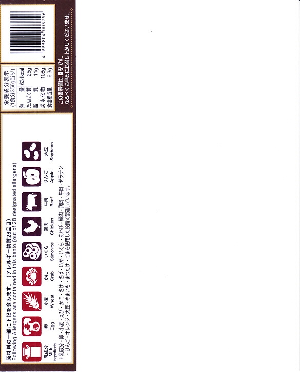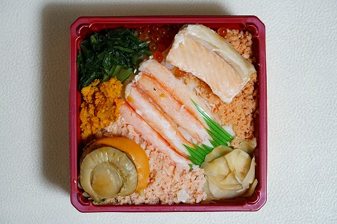 秋冬の駅弁大会シーズンに向けた、2017(平成29)年秋の新作。スーパーやデパートでの駅弁大会シーズンに向けて、秋は見栄えの良い駅弁の新作がよく出てくる。他の新函館北斗駅弁と同じく、スリーブの上面に駅弁の名前と中身の写真を半分ずつ載せる。中身は酢飯の上に玉子焼、サーモンのような鮭のこぶ〆、ガリ、カニほぐし身、イクラを並べるもの。見本の写真に違わない見栄えと、安定した味。現地で売られたかは不詳。翌年のシーズンを待たずに終売か。