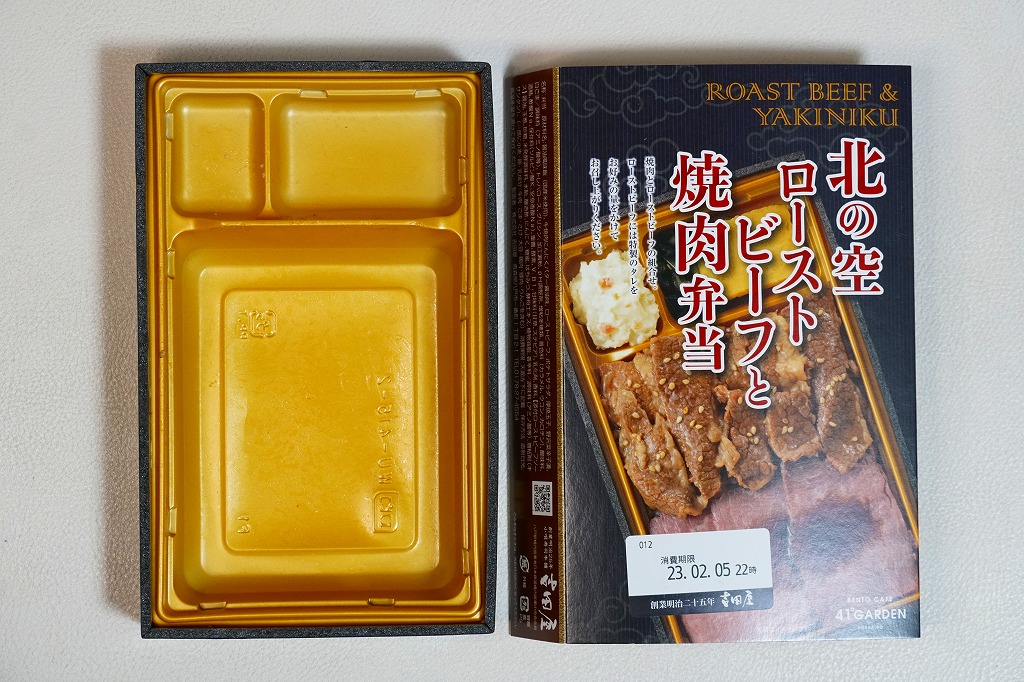 秋冬の駅弁大会シーズンに向けた、2019(令和元)年秋の新商品。長方形の容器に茶飯を敷き、牛焼肉にんにくバター醤油味とローストビーフで半分ずつ覆い、ポテトサラダと玉子焼と野沢菜を添える。「北の空」を除くと、名前どおりのローストビーフと焼肉弁当。函館でなく十勝の帯広あたりにあれば、牛肉とじゃがいもで北海道だと思えたか、勘違いできたかもしれない。主に現地でなく催事で売られる商品か。価格は2020年時点で1,250円、2022年時点で1,300円。2023年3月頃で終売か。