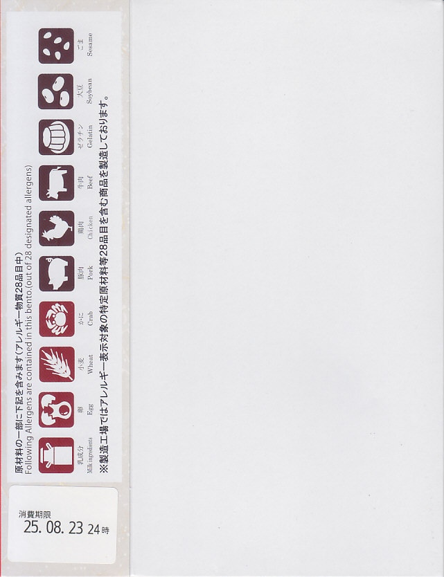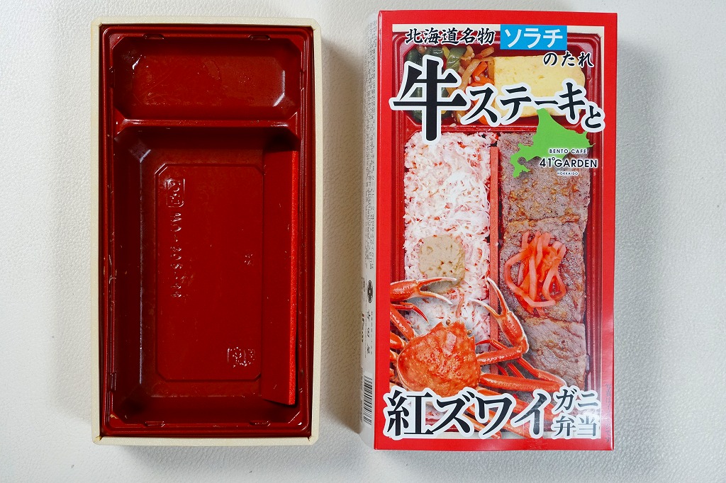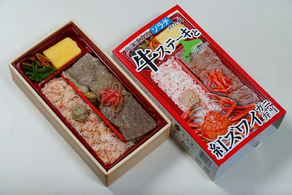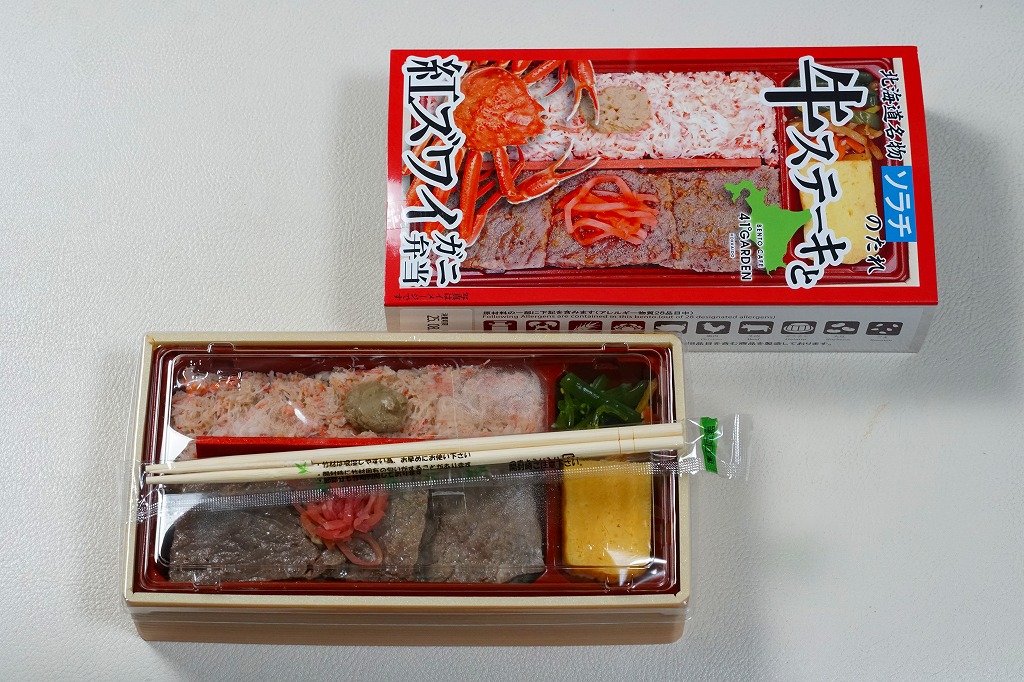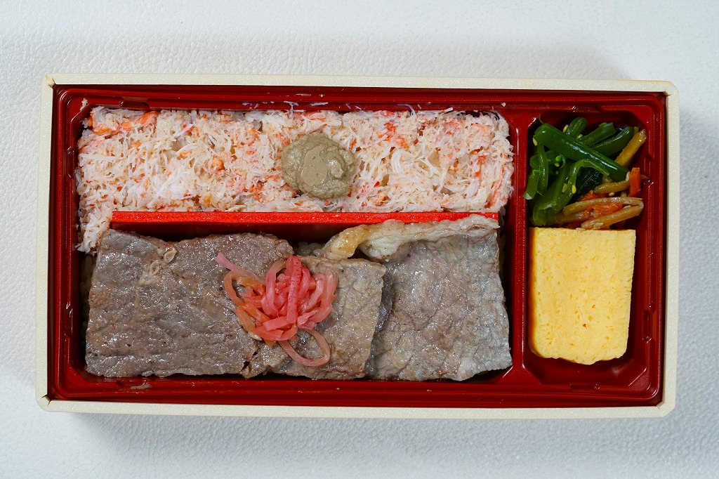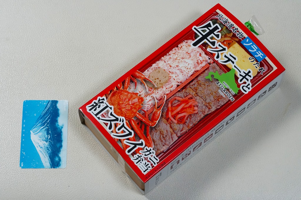 2025(令和7)年の5月までに各地で発売か。長方形のプラ容器に茶飯を詰め、1列を牛ステーキで覆い紅生姜を載せ、1列をベニズワイガニのほぐし身で覆いカニ味噌を載せ、きんぽらごぼう、茎わかめお、玉子焼きを添える。スリーブの文字によると、牛肉の味付けに「北海道名物ソラチのたれ」、ジンギスカンや豚丼のタレで知られる北海道芦別の調味料製造業「ソラチ」の製品を使ったのだろうか。甘めでサラサラな触感だった。価格は2025年の購入時で1,480円、秋の時点で1,600円。