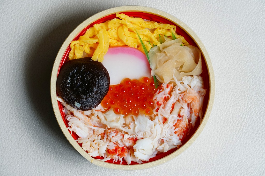 秋冬の駅弁大会シーズンに向けた、2023(令和5)年秋の新商品。どうもスーパーやデパートの駅弁催事に出てきていない、めったに売られないお弁当である模様。丸いプラ容器に酢飯を詰め、たらばがにと錦糸卵で覆い、しいたけ、かまぼこ、甘酢生姜、イクラを載せる。酢飯の酢の弱さと柔らかい玉子焼の助けで、カニとイクラを味わえたと思う。なお、タラバガニは函館朝市でも買ったり食べたりできるが、通常は函館港でのタラバガニの水揚げは無いという。