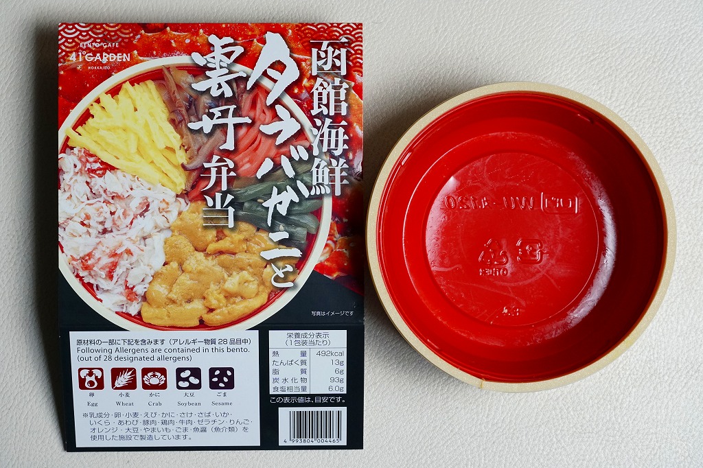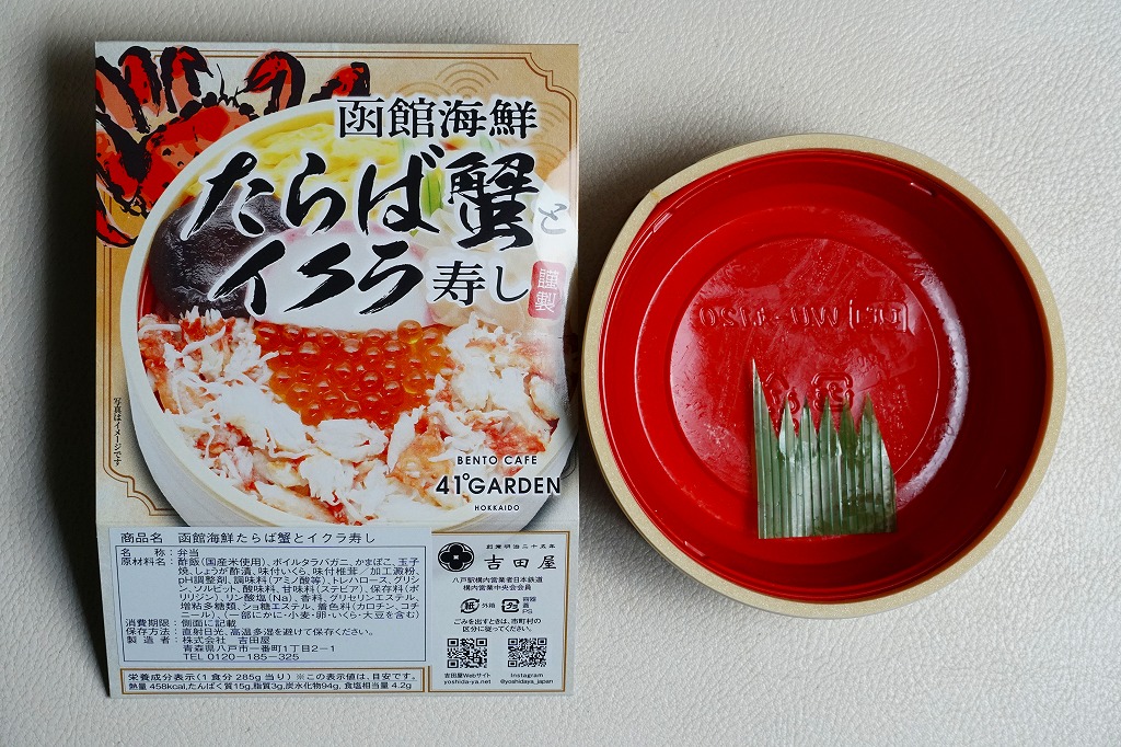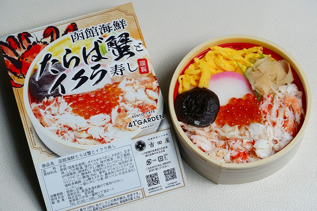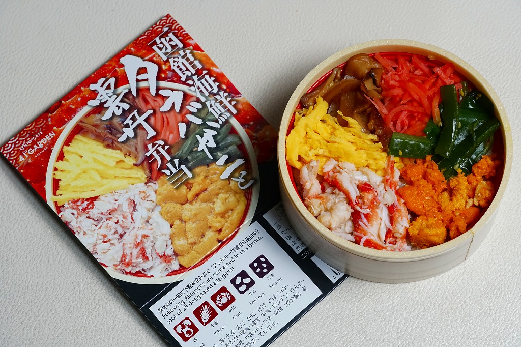 中身の写真を美しく載せたスリーブにはめた、やや上げ底で正方形のプラ容器に、酢飯を詰め、鮭フレーク、かにフレーク、蒸しうに、わさび菜、イクラ、ガリで覆い、ホタテ煮、サーモンハラス焼き、カニ脚肉を並べる。内容では典型的な北海道を名乗る海鮮弁当を、常温でも持ち運べる駅弁の体にした感じで、そんな需要があれば向きそう。スリーブの宣伝文からもたぶん、函館駅前の市場とは関係ない。価格は2022年時点で1,580円、2023年時点で1,680円、2025年時点で1,800円。