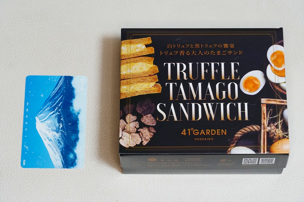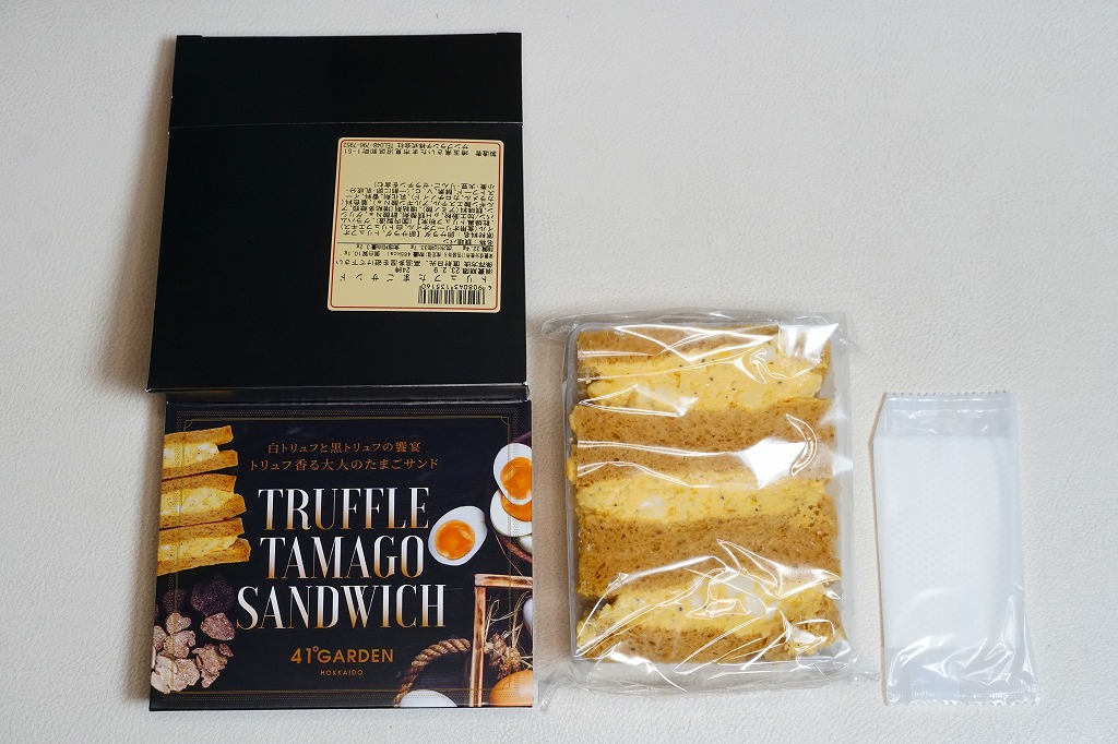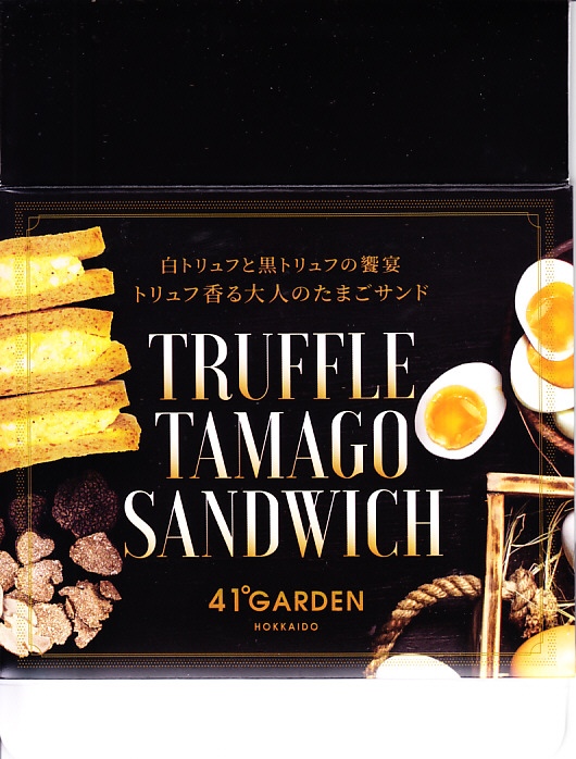 食品表示での商品名は「トリュフたまごサンド」。2023(令和5)年1月までに、東京駅や駅弁催事などで発売か。トリュフのオイルとエキスと粉末を混ぜた卵サラダを、グラハム粉を使う茶色い耳なし食パンで挟んだサンドイッチを3切れ、半透明のプラ製トレーに収めて透明な袋で密封し、商品名と具材などを描いた黒い紙箱に収める。食べればただのたまごサンドに思えてしまい、どうすればトリュフの味や香りを感じ取れるか。紙箱に「41°GARDEN」「HOKKAIDO」とあるため、ここでは新函館北斗駅の駅弁とみなすが、製造者は埼玉県さいたま市の食品工場であった。