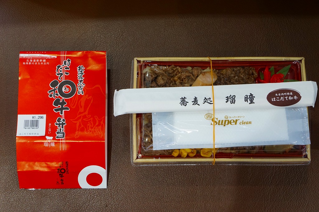 はこだて和牛とは、函館市内ではなく木古内町内で1990年代から使われる、同町内で生産するあか牛(褐毛和牛)のブランド名。脂肪でなく赤身の柔らかさとうまさが特徴。特段の宣伝も拡販もなく、地元で作られて食べられる。木古内駅近くのそば屋「蕎麦処 瑠瞳(るとう)」では、和牛御膳、和牛バーガー、和牛弁当のメニューを取りそろえ、そのひとつがこの弁当である。
