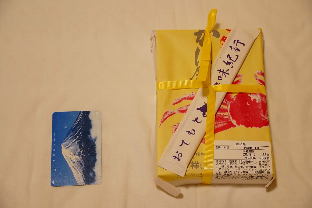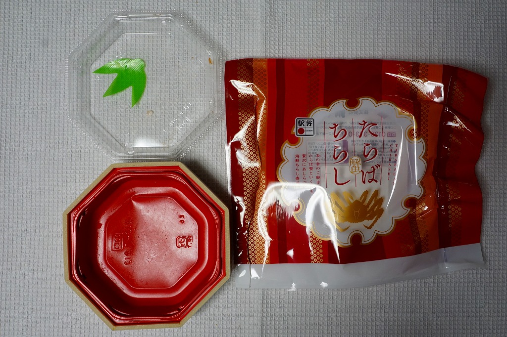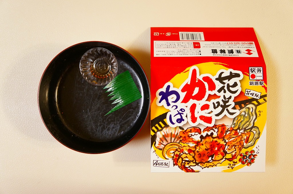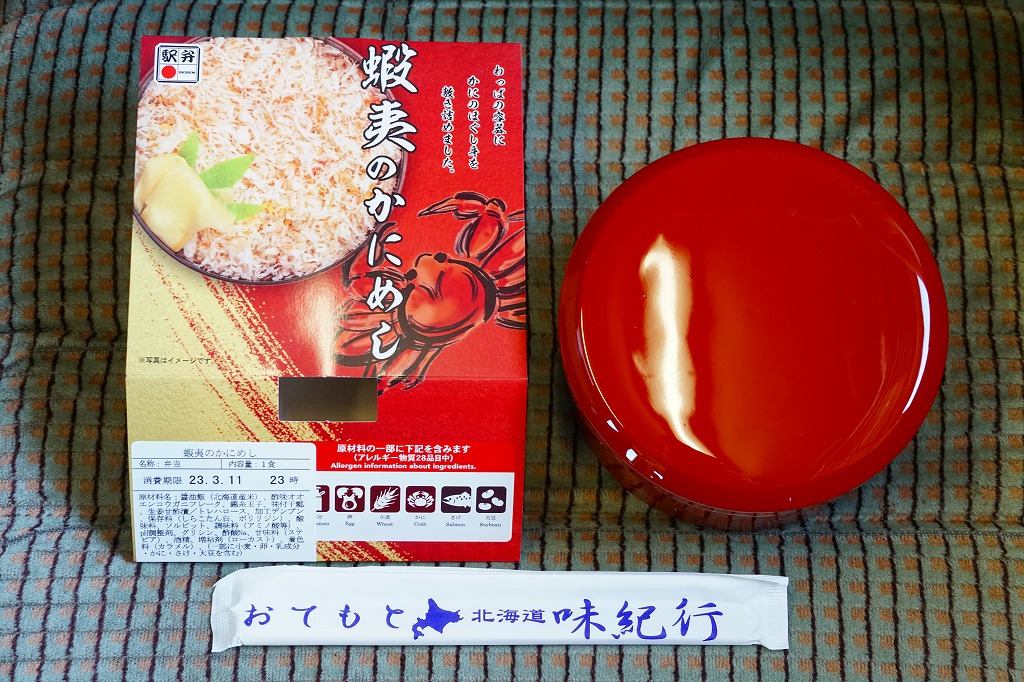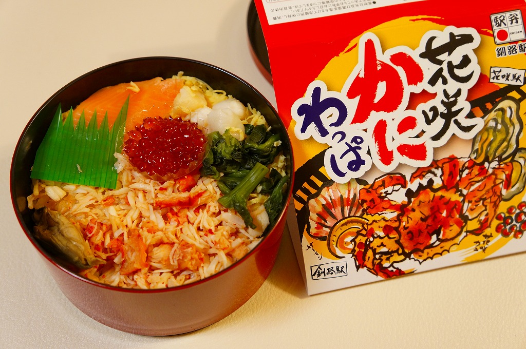 2022(令和4)年9月1日に釧路駅などで発売。とはいえその姿は、旭川駅かどこかの北海道駅弁やその催事で、見慣れたものだと思う。旭川駅弁「蝦夷わっぱ」などでも使われる、一瞬は漆塗りの器に見えるかもしれない赤いプラ製の容器に、醤油飯を詰め、錦糸卵とカニフレークで覆い、甘酢生姜を添える。冷蔵便で輸送販売される駅弁としては、この姿でよい、この姿がよいのだろう。令和の時代になっても、北海道の駅でカニの駅弁が買えるという需要に応えられる。