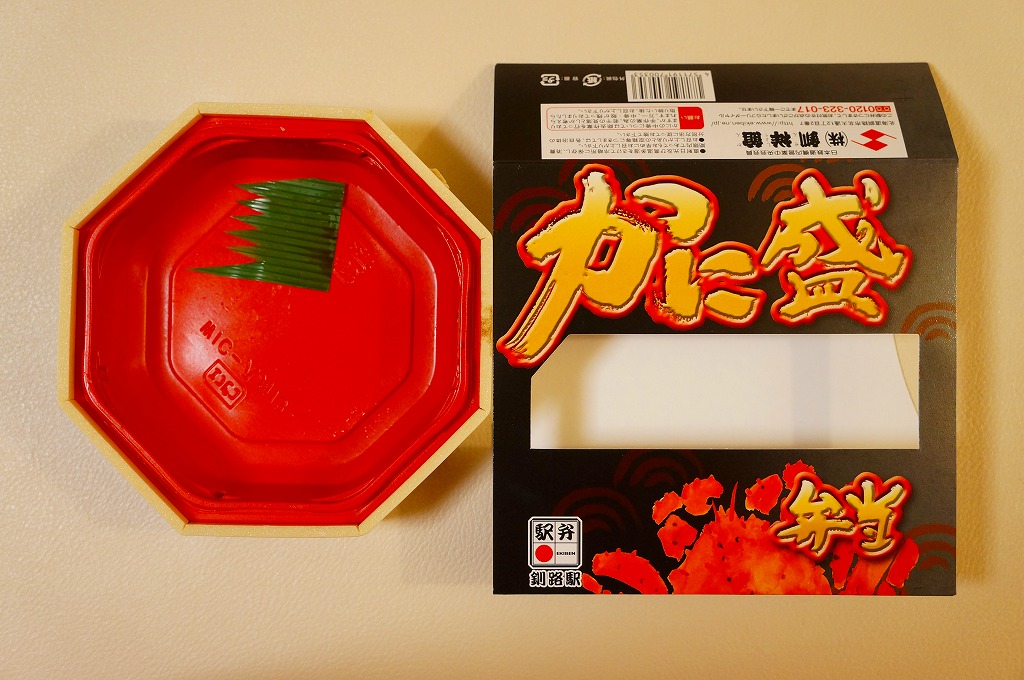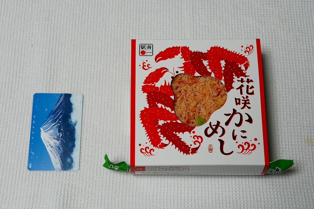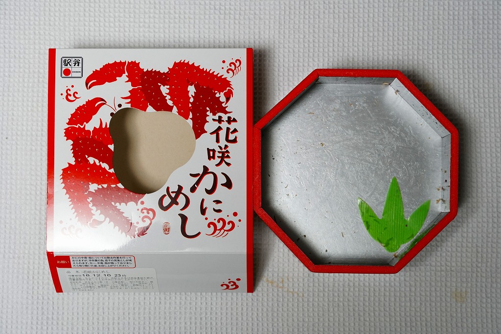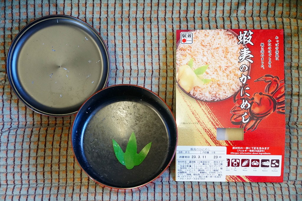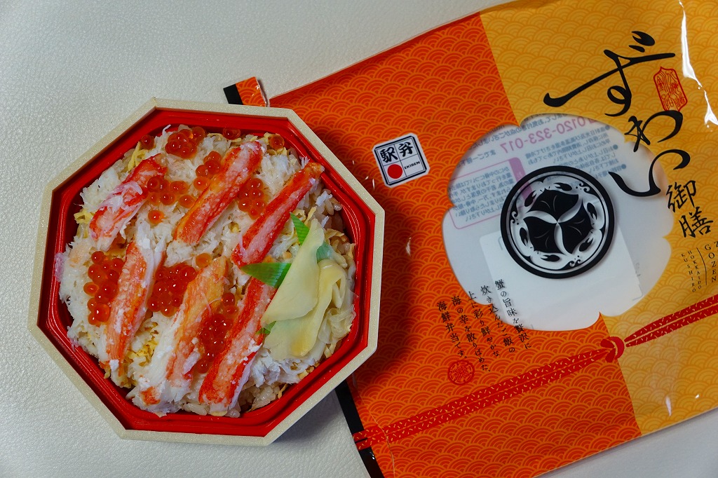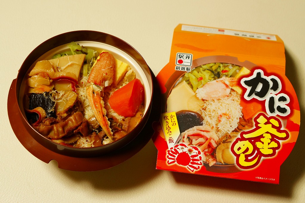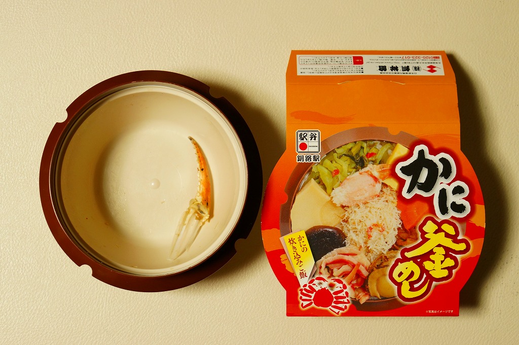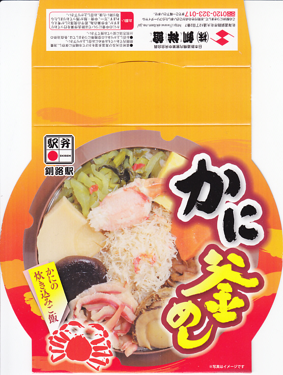 秋冬の駅弁大会シーズンに向けた、2014(平成26)年秋の新商品か。駅弁の名前のとおり、プラ製の釜にカニの炊込飯を詰め、カニのハサミとほぐし身と、ホタテ、ホッキ貝、玉子焼、タケノコ煮、ニンジン煮などで覆うカニ飯。期待どおりの内容で、見た目にカニは少なくても、風味はカニ。今回はどうも1シーズンのみの販売だったようだが、同じような駅弁は今後も各地で何度も出てくるだろう。