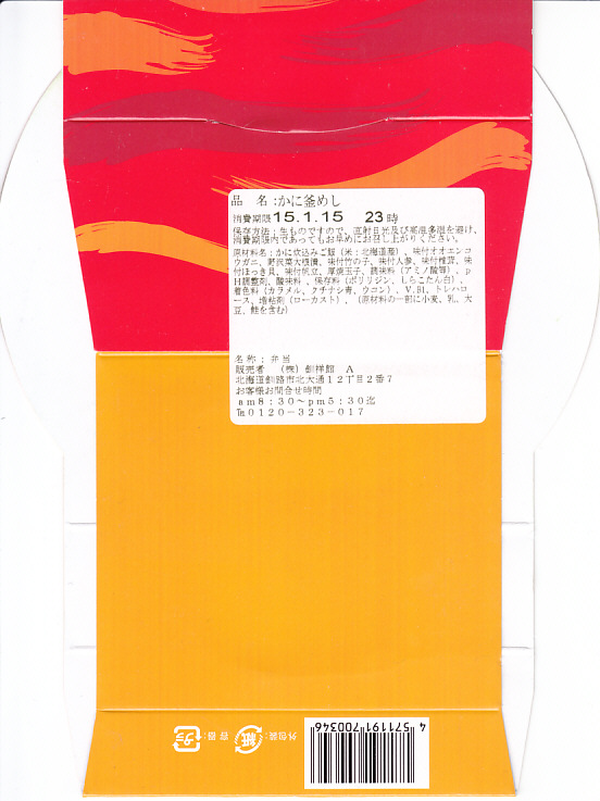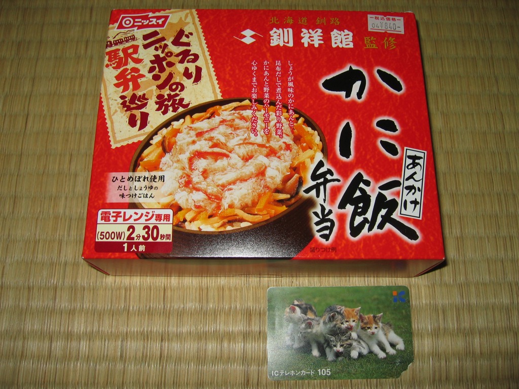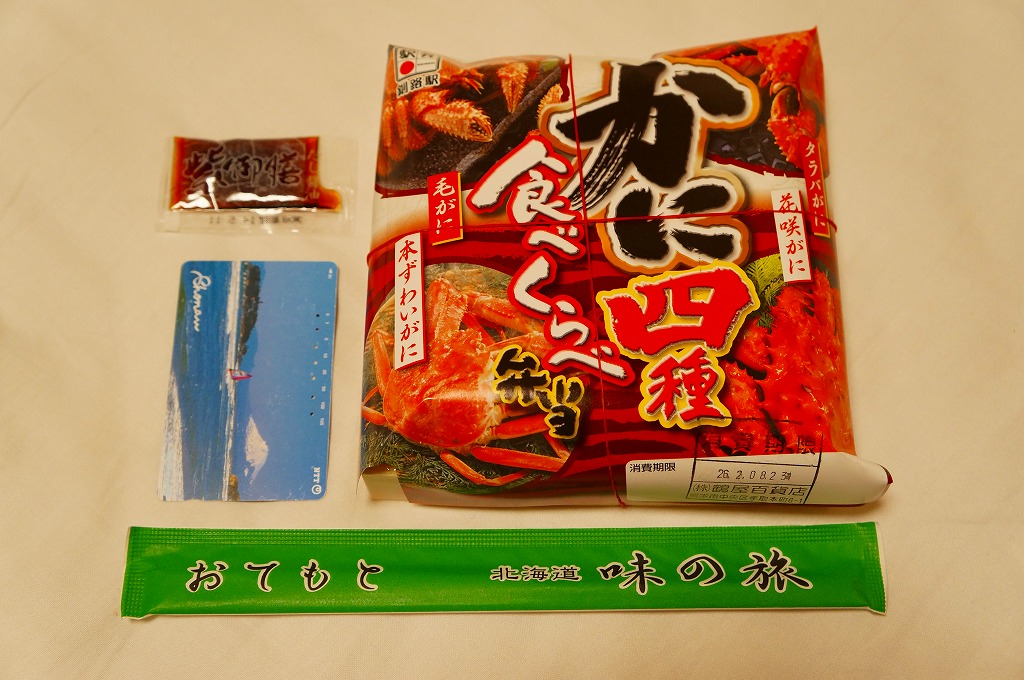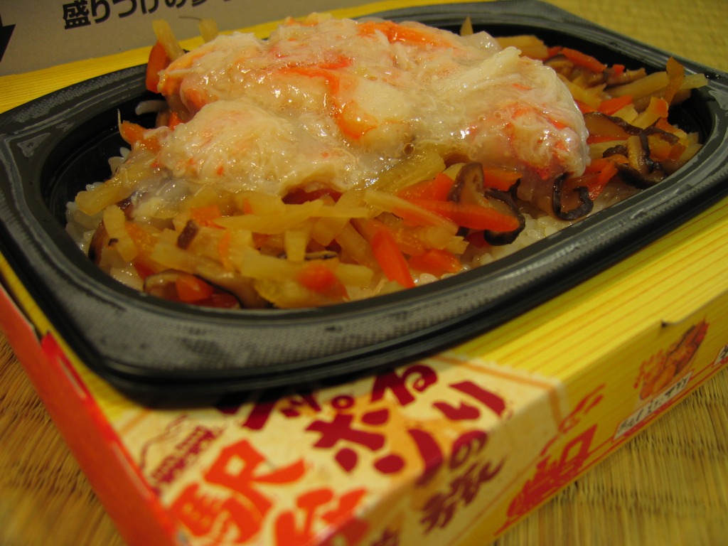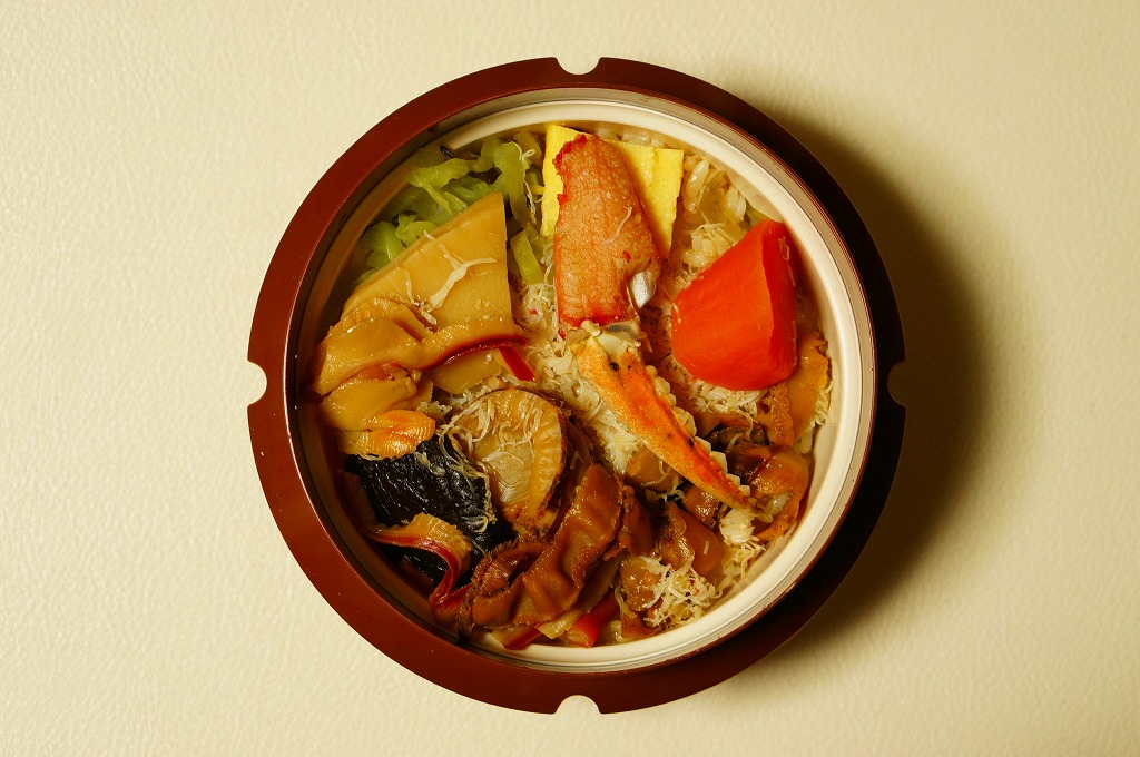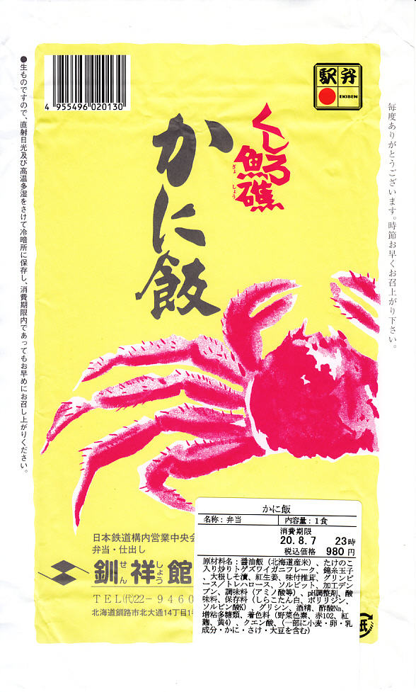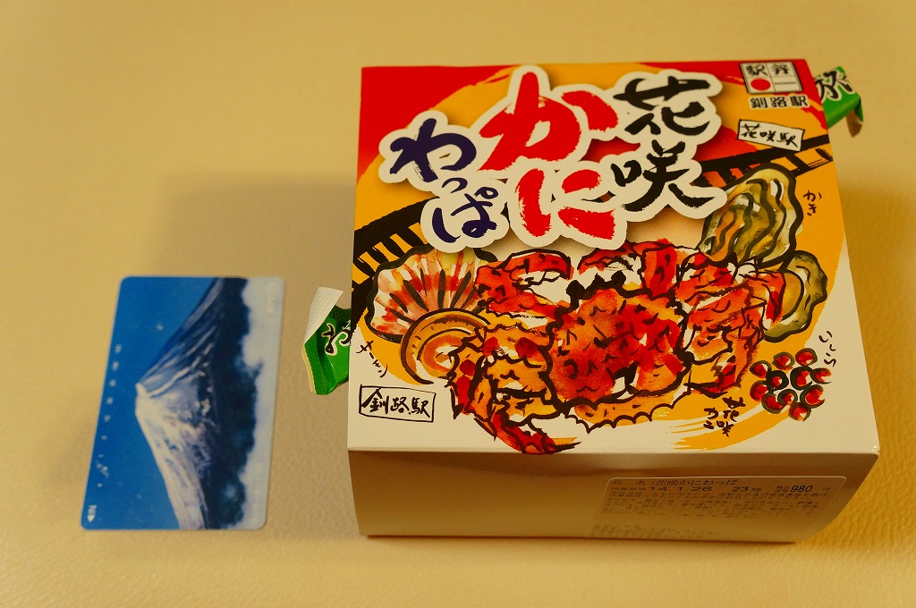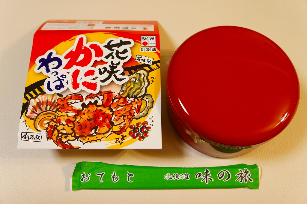 秋冬の駅弁大会シーズンに向けた、2014(平成26)年秋の新商品か。駅弁の名前のとおり、プラ製の釜にカニの炊込飯を詰め、カニのハサミとほぐし身と、ホタテ、ホッキ貝、玉子焼、タケノコ煮、ニンジン煮などで覆うカニ飯。期待どおりの内容で、見た目にカニは少なくても、風味はカニ。今回はどうも1シーズンのみの販売だったようだが、同じような駅弁は今後も各地で何度も出てくるだろう。