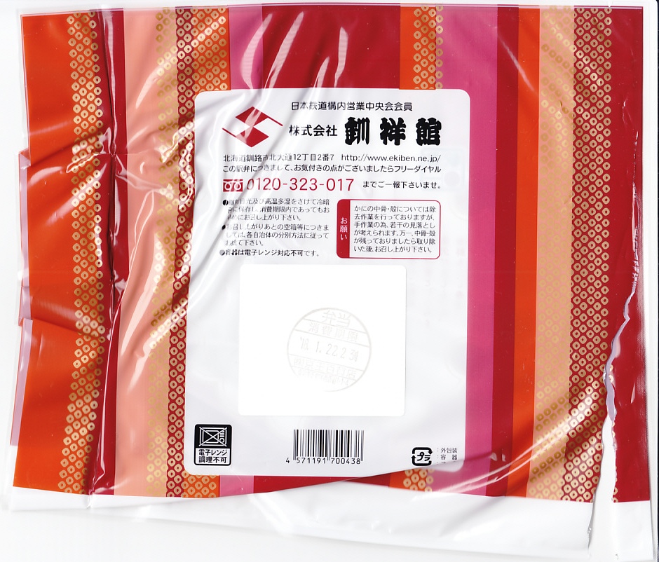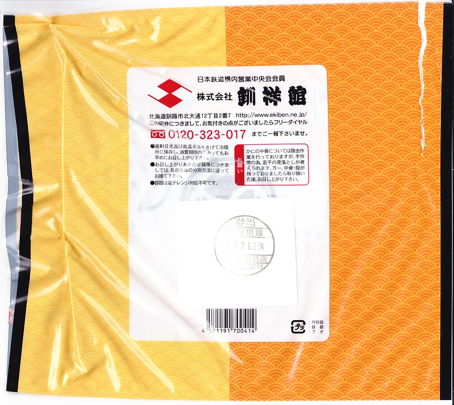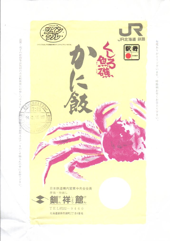 2002(平成14)年2月15日に購入した、釧路駅弁の掛紙。中身は上記の18年後と、まったく同じ。掛紙も変わらないが、当時はJR北海道とその旅行ブランドのロゴマークも記載していた。調製元の所在地が少し異なる。