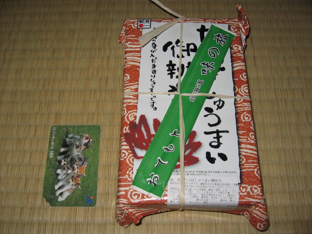 2006(平成18)年の秋頃に発売か。木目調にしては色黒な長方形の容器に透明なふたをして、商品名を書いた掛紙で包んで、ひもで十字にしばる。中身はグリーンピースの醤油飯にたらば焼売が4個、椎茸やフキなどの煮物に大根みそ漬など。焼売に見た目も風味も少々の値段相応なカニを感じるが、駅ではなく催事場で売るための弁当なのだろうなという風味も、中身や食品表示ラベルから感じられてならなかった。2012年までの販売か。