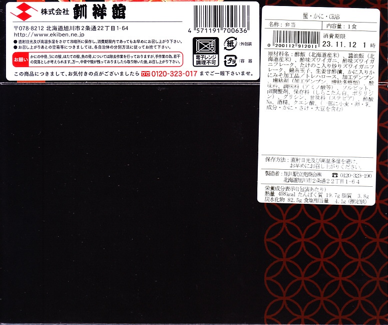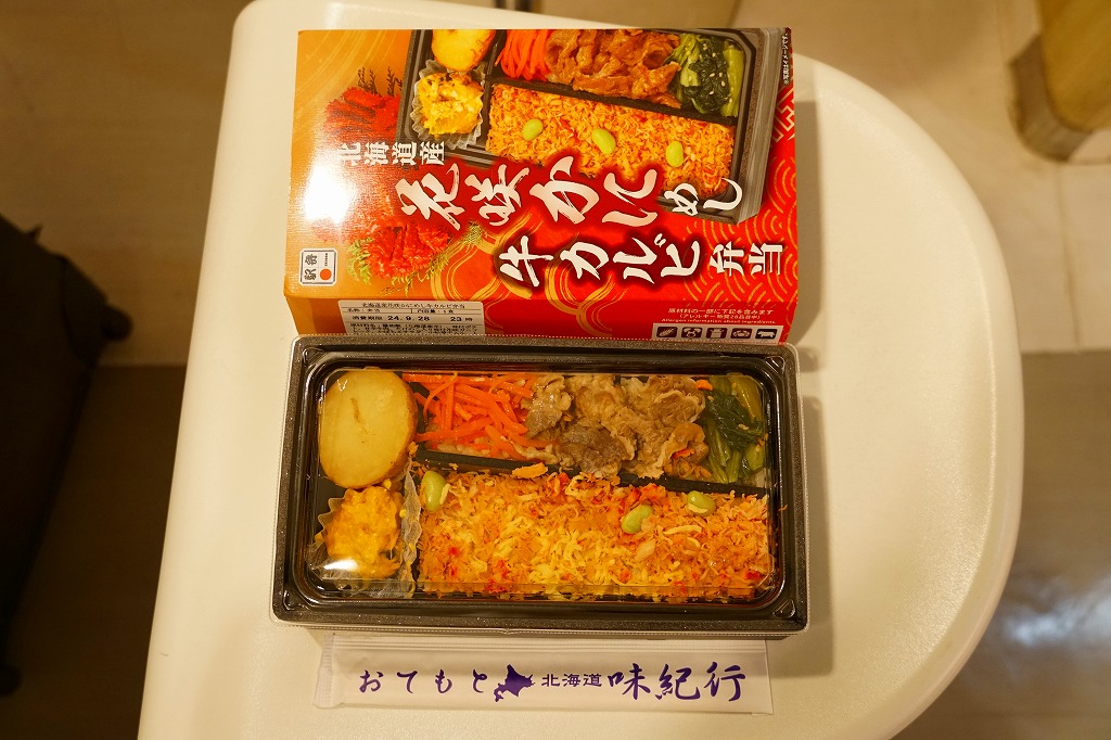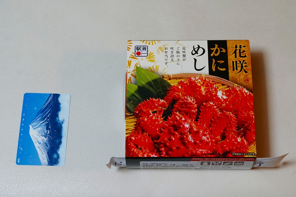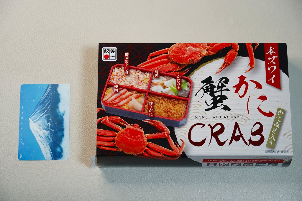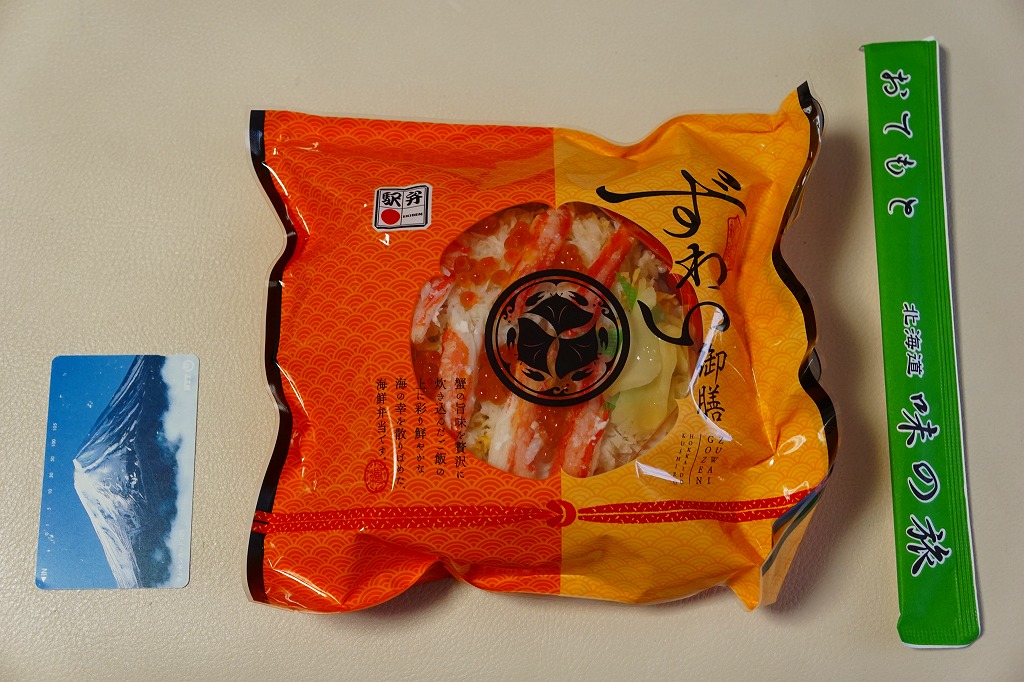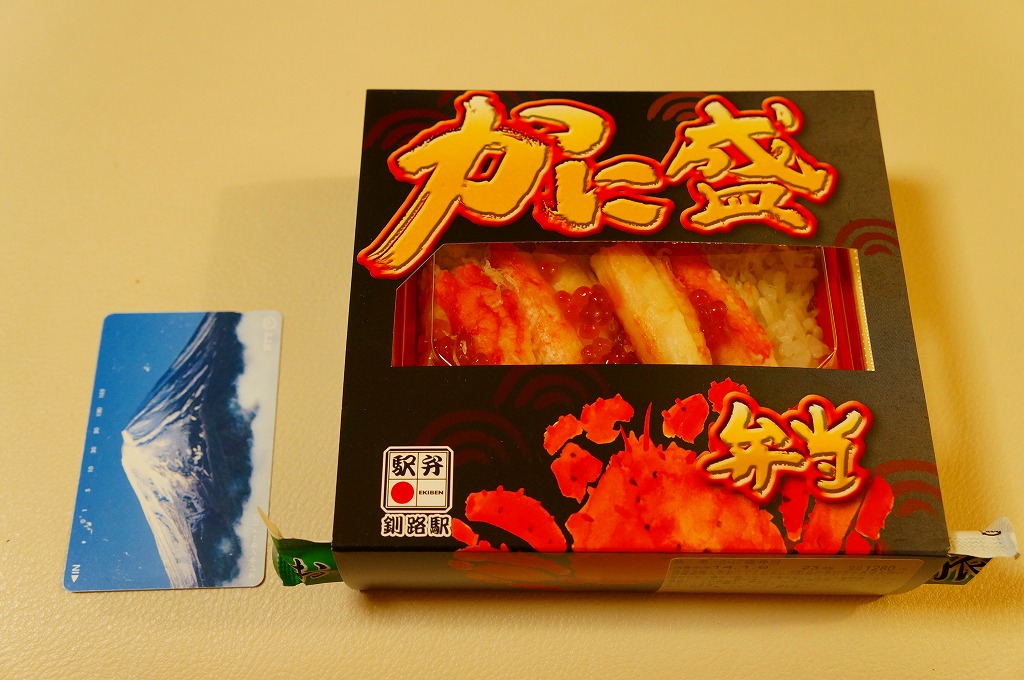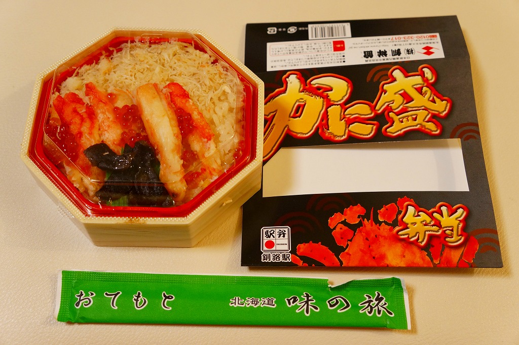 秋冬の駅弁大会シーズンに向けた、2023(令和5)年秋の新商品か。駅で売ったり駅弁大会に出てくる稚内駅弁と同じ、長方形容器の4区画すべてに、酢飯や醤油飯を詰め、かに棒肉と錦糸卵とガリ、酢味ほぐし身と錦糸卵、炒りがにとタケノコ、肩肉とかにみそで、やはり4区画すべてにズワイカニを載せる。カニの文字と絵柄と中身の写真が賑やかなスリーブほどでなくても、カニをいろんな姿で詰めているから、都会での駅弁催事に向きそう。実際にこれも東京駅で買ったし、きっと釧路駅よりも売れる個数は多いと思う。