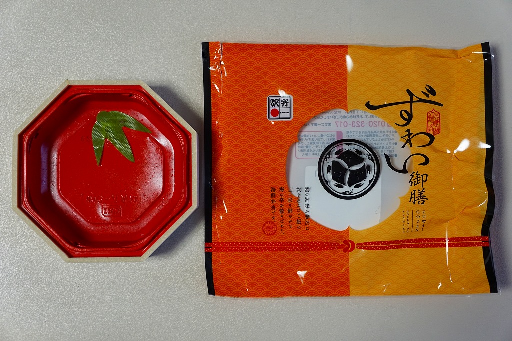 2018(平成30)年1月の京王百貨店の駅弁大会で実演販売。正八角形の容器に茶飯を詰め、タラバガニのほぐし身で覆い、イクラで彩り、フキとガリを添え、透明なふたをして、フィルムの袋に密封していた。そんな姿は下記の「ずわい御膳」そっくり。最近の旭川駅弁と釧路駅弁の実演販売では、このような商品が見られる。2020年までの販売か。