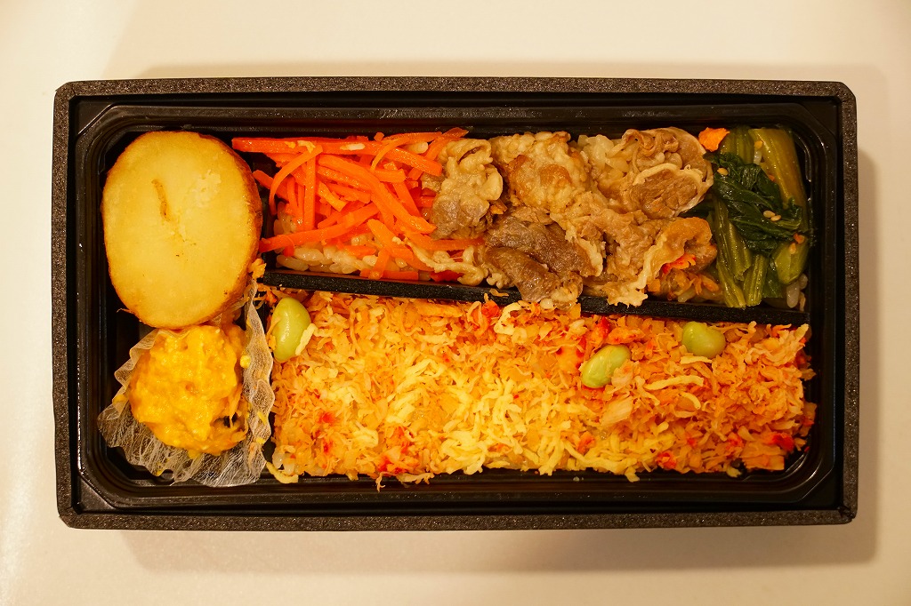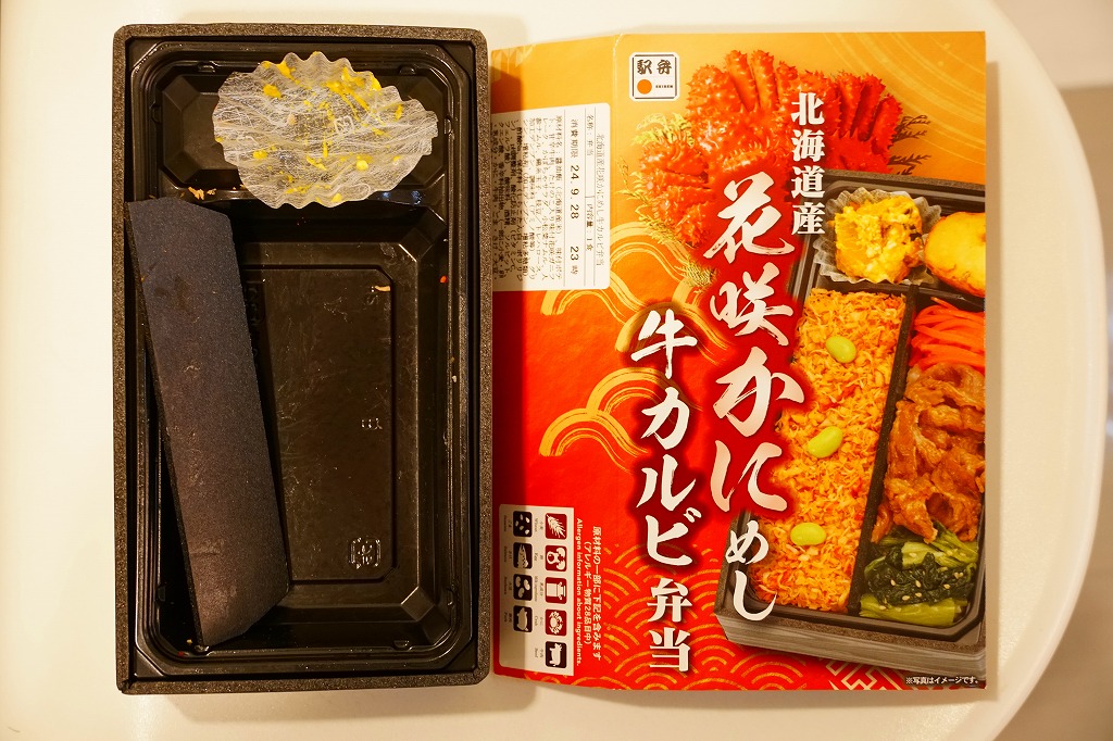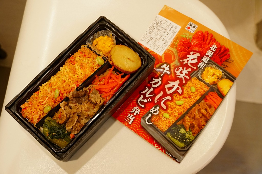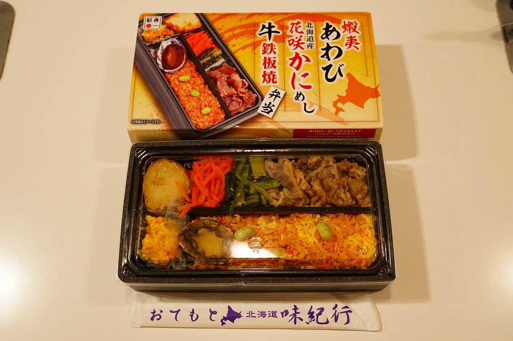秋冬の駅弁大会シーズンに向けた、2024(令和6)年秋の新商品で、全国のスーパーの駅弁催事へ出荷。真っ黒な長方形のプラ容器で、醤油飯を細長く2列に敷き、一方をタケノコ入りカニフレークと枝豆で、他方を牛肉と小松菜と人参で覆い、ポテトサラダとカボチャサラダを添えるのは、スリーブの写真そのまんま。これは同じ日に同じ場所で買った上記の「蝦夷あわび北海道産花咲かにめし牛鉄板焼弁当」の、商品名と中身から蝦夷あわびを抜いたものではないか。それなのに値段が変わらないのは、おそらく牛鉄板焼を牛カルビに格上げして相殺したか。常温で食べれば同じ駅弁。