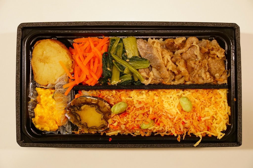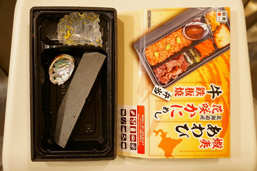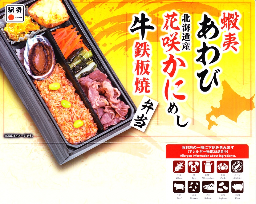 秋冬の駅弁大会シーズンに向けた、2024(令和6)年秋の新商品で、全国のスーパーの駅弁催事へ出荷。それにしてもなんと欲張りな商品名だろうか。真っ黒な長方形のプラ容器で、醤油飯を細長く2列に敷き、一方をアワビとタケノコ入りカニフレークと枝豆で、他方を牛肉と小松菜と人参で覆い、ポテトサラダとカボチャサラダを添えるのは、スリーブの写真そのまんま。食べれば商品名ほどの混乱はなく、カニや牛肉それぞれの味で御飯を食べられる。前日に購入した「かきめしと甘海老、かに、いくら寿し」と同じく、なぜ八戸の駅弁が釧路にあるのかと勘違いした。