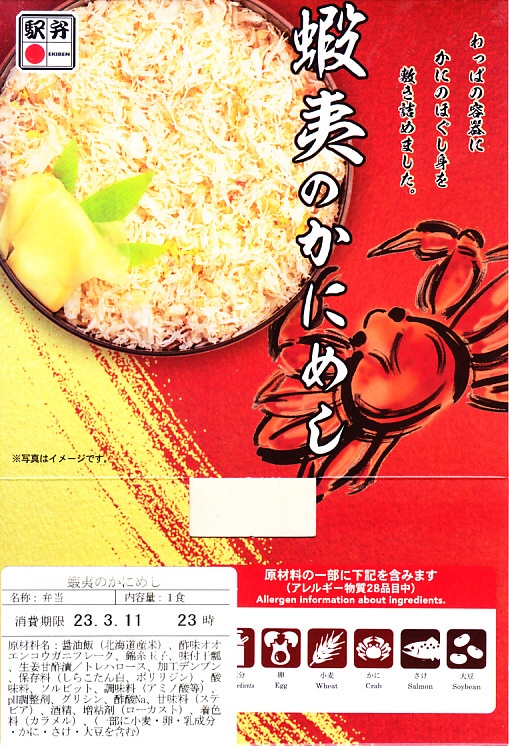 底の浅い長方形の容器の全体に、カニの味付け御飯を敷き詰め、その上に水分を飛ばしたカニの身を敷き、椎茸3切れに錦糸卵と紅生姜を散らして完成。味の刺激が強い紅生姜が、カニの風味を消しそうに見えて、食べれば逆にカニの味の引き立て役をうまく演じているようで、紅生姜が苦手でも食べられた。価格は2002年の購入時で850円、2010年時点で810円、2014年時点で840円、2018年時点で980円、2023年時点で1,080円。