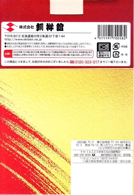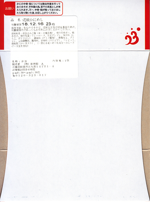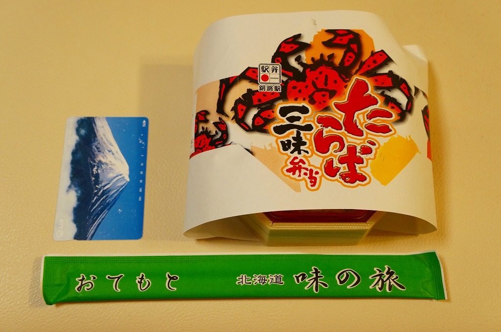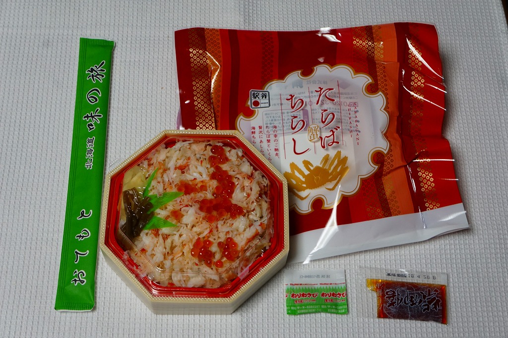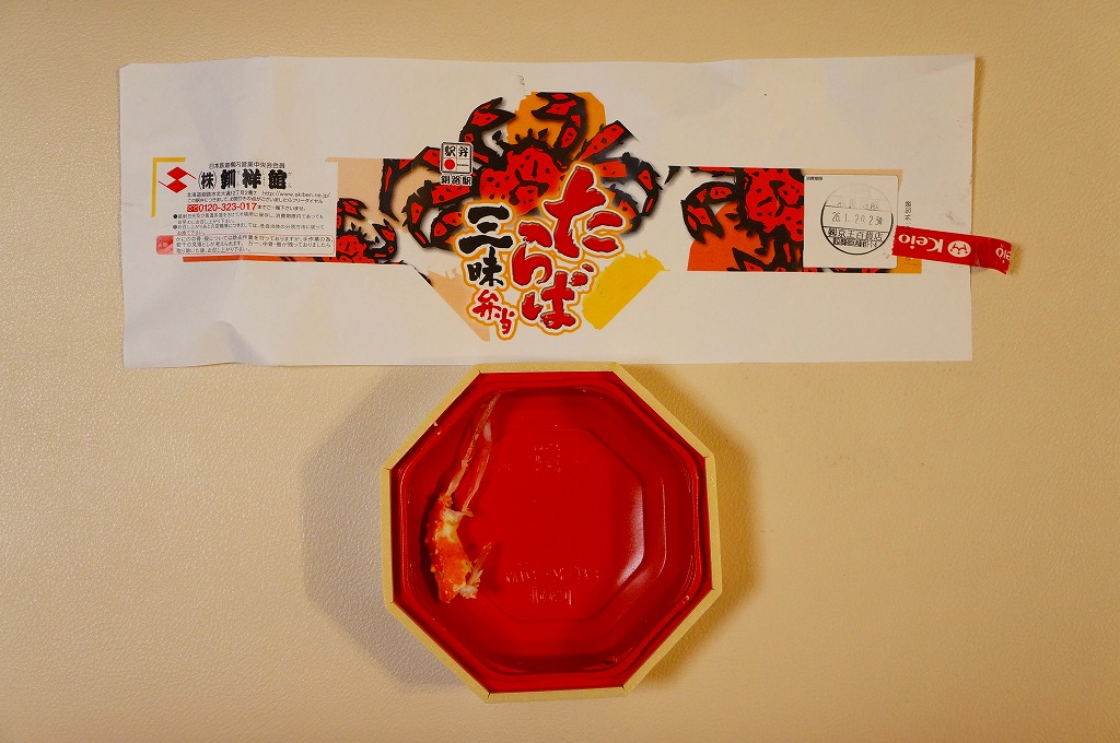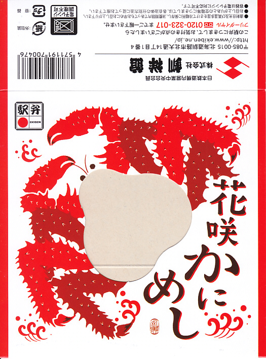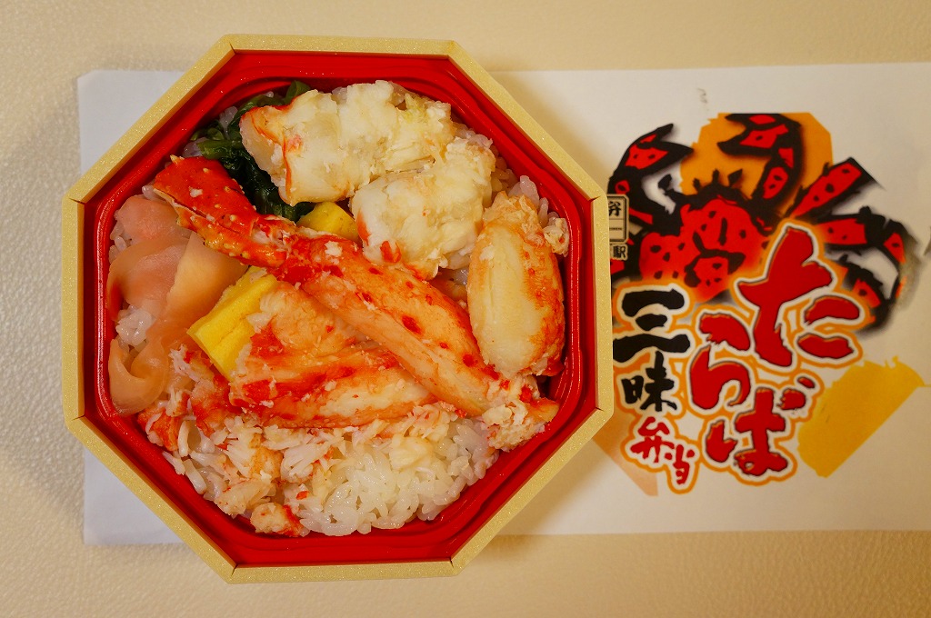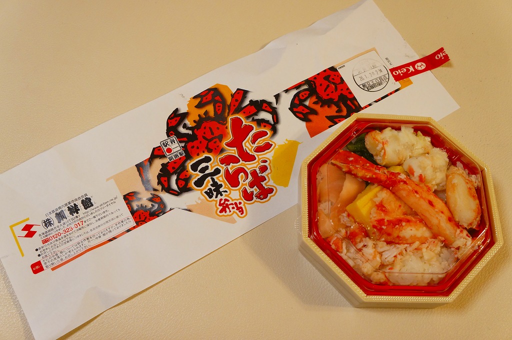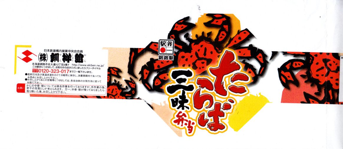 2014(平成26)年1月と、2015(平成27)年1月と、2016(平成28)年1月の京王百貨店の駅弁大会で実演販売。2015年と2016年の鶴屋百貨店の駅弁大会でも同様。これ以外の場所では売られていないのではないかと思う。正八角形の容器に酢飯を詰め、タラバガニのほぐし、ブロック、脚、棒肉で厚く覆う姿は、前世紀からの釧路駅弁「たらば寿し」に似ているカニ三昧。照りが強くないことと、上げ底をせず上げ蓋も軽いことで、掛紙の使用も含めて、より駅弁らしい体裁を持っていた。京王百貨店の駅弁大会では販売個数で3位に付ける人気。そんな評価とこんな内容であれば、釧路駅でも売れそうなものなのだが。2017年には出なかった。