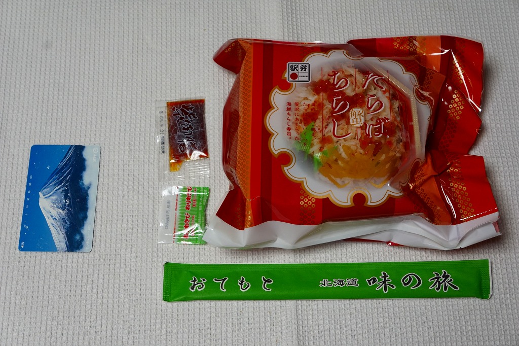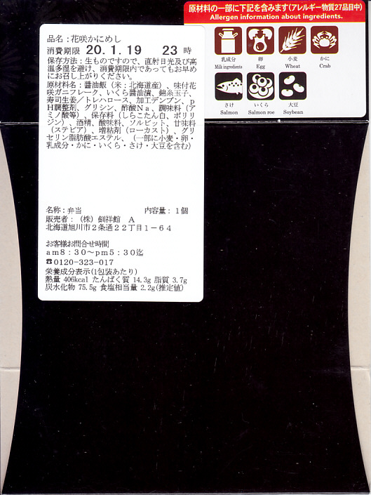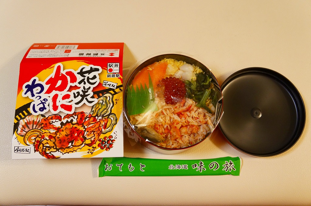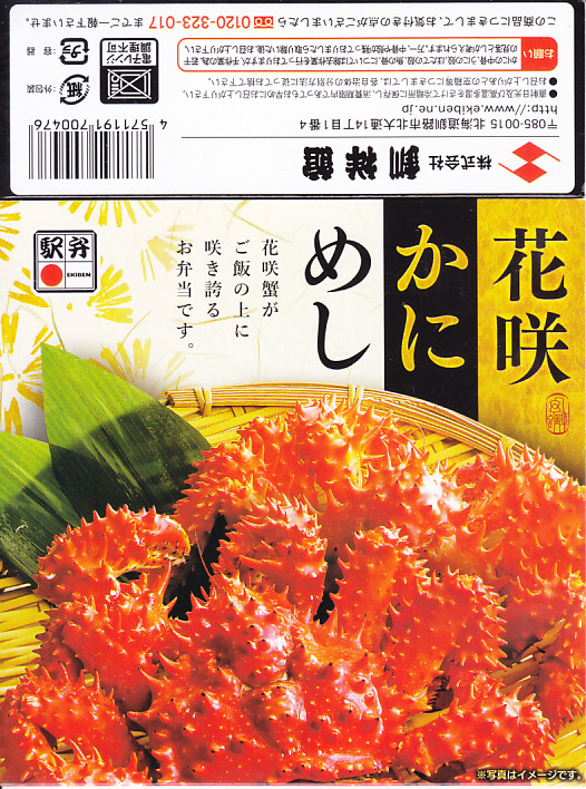 秋冬の駅弁大会シーズンに向けた、2013(平成25)年秋の新商品か。現地で売らない疑義駅弁と考えられる。丸くて固いプラ製の容器に醤油飯を詰め、ハナサキガニのほぐし身、ホタテでなくイタヤガイの酢漬け、サーモン、カキ、菜の花、錦糸卵で覆い、イクラ醤油漬のカップを添える。ハナサキガニの荒いフレークのキュッキュとした食感が好きです。パッケージには「釧路駅」とともに「花咲駅」と書いたが、花咲駅で駅弁が売られることはないと思う。