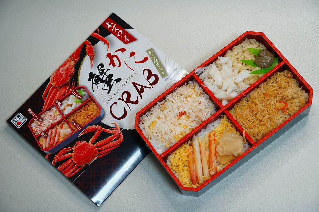 2014(平成26)年2月の鶴屋百貨店の駅弁大会でのみ販売か。容器の4区画に、茶飯をケガニの醤油フレークで覆う毛がに丼、酢飯をズワイガニの脚肉とほぐし身で覆うズワイガニ丼、茶飯をハナサキガニの醤油フレークで覆う花咲がに丼、酢飯をタラバガニのブロックと錦糸卵で覆うタラバガニ丼が同居。旭川駅や稚内駅の駅弁でも、百貨店の北海道催事でも、よく見られるタイプのカニ弁当。