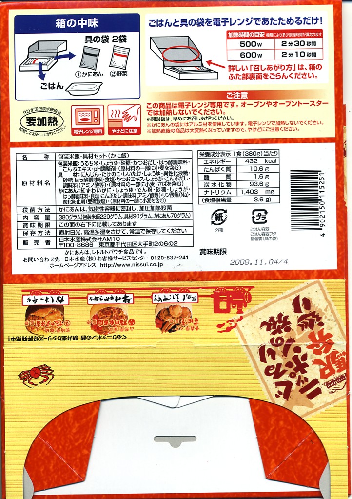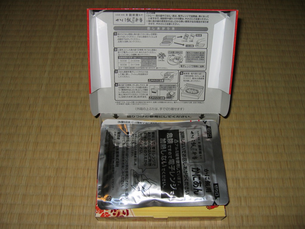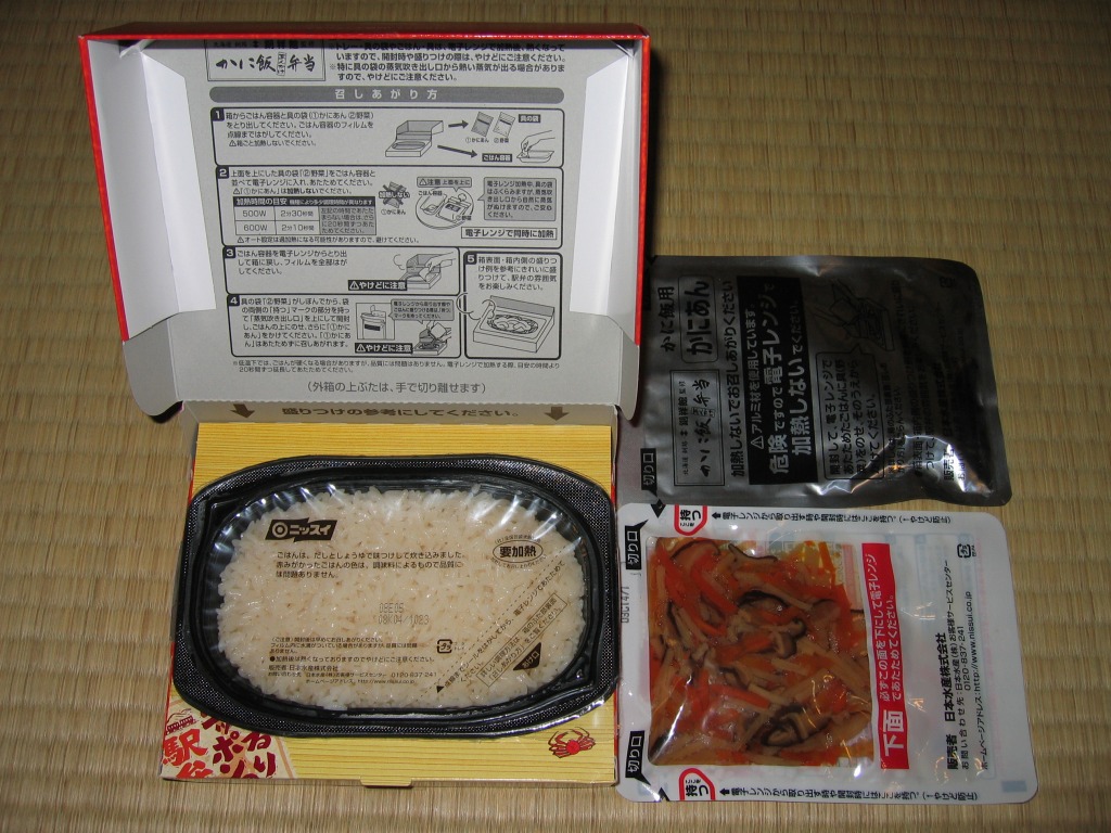 中身は醤油飯の上に、暖めたレトルトに入っていたタケノコや椎茸の炒め物と、暖めないレトルトに入っていたカニあんかけを載せるもの。釧路駅の駅弁と1対1に対応する商品はないと思うが、カニ駅弁の雰囲気は出ていると思う。ただ、味は少々塩辛い感じ。
