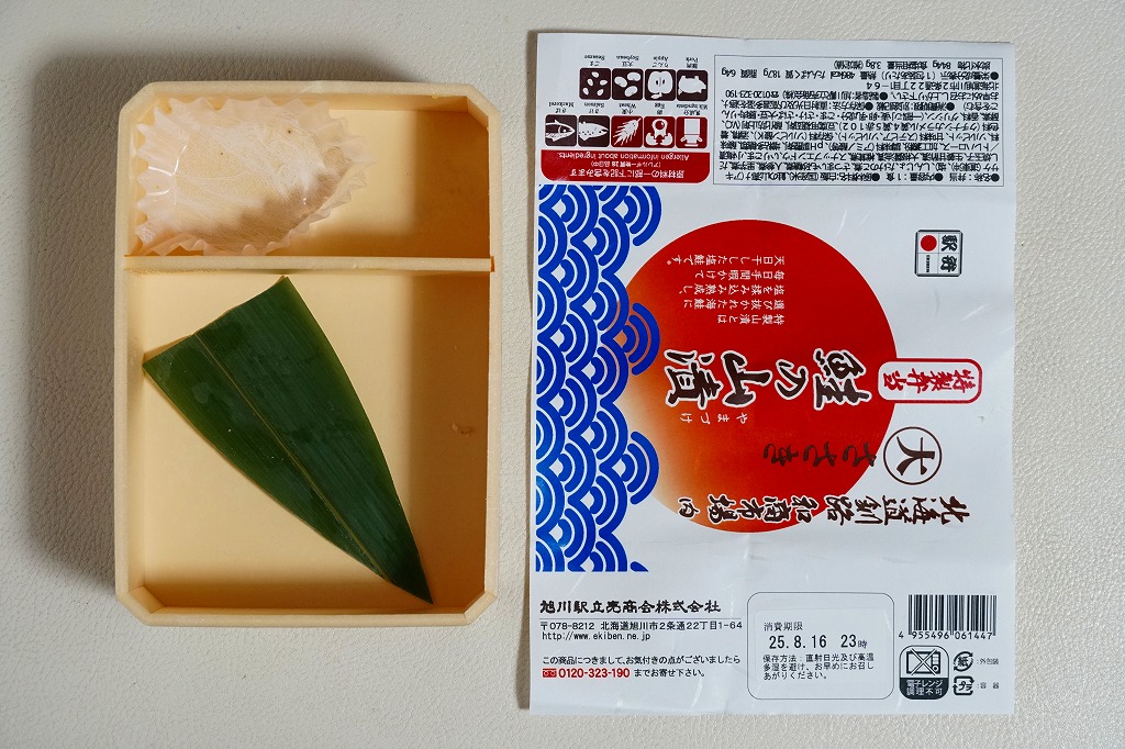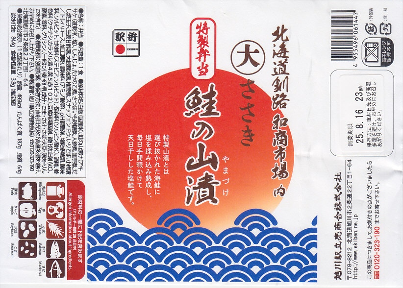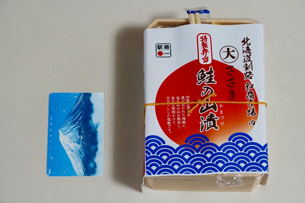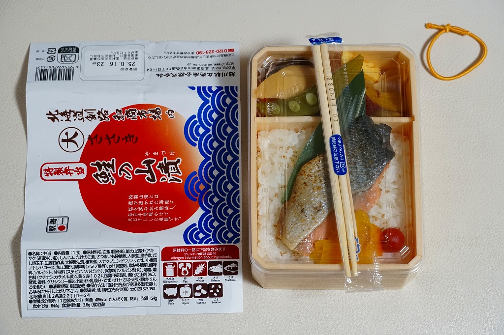 おそらく2025(令和7)年7月に釧路駅で発売。釧路駅近くの公設市場「釧路和商市場」で塩干魚魚卵専門店を名乗る魚屋「丸大ささき」の名を、海と日の丸に見える掛紙に記す。中身は白飯に焼鮭を載せ、たくあんと梅干しを添え、煮物、しんじょ、さつまいも、だし焼玉子を詰めるもの。この焼鮭が商品名の「鮭の山漬」といい、この姿で食べてしまえば普通の鮭弁当に思える。釧路駅弁の調製元が「旭川駅」なのは事実として、そのために早速東京で輸送販売されており、これを買ったのはなんと千葉駅の駅弁売店。
