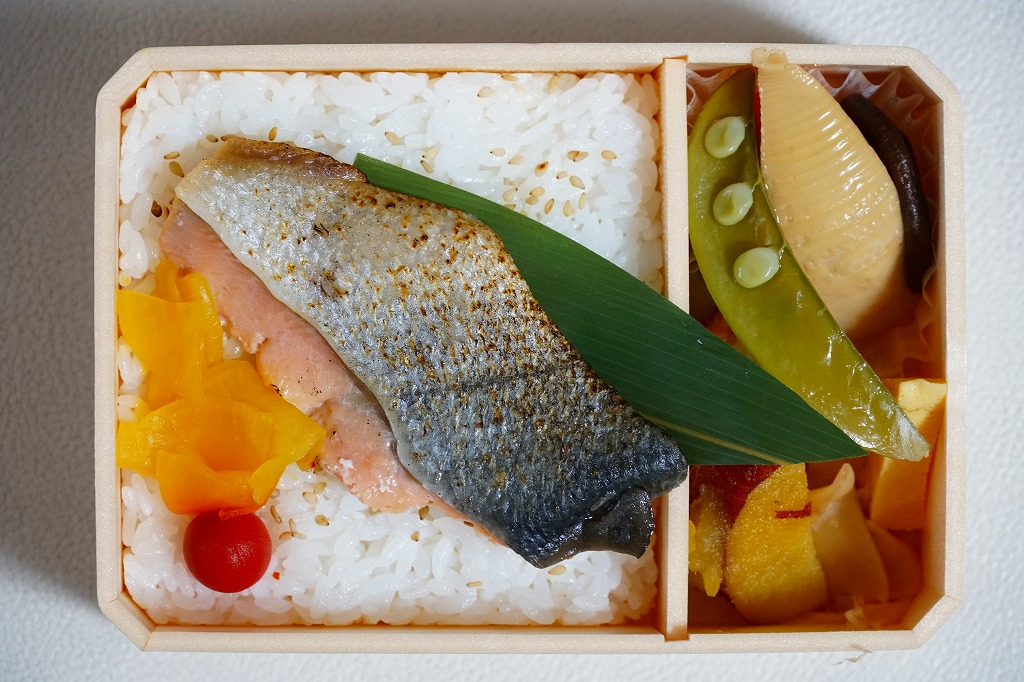 長方形の容器に、鮭を描いた秋色の掛紙をかける。中身は対角線で二分割され、一方に白御飯を敷き焼鮭を1切れ載せ、もう一方にエビや煮ホタテやホタテフライに筋子や玉子焼などを詰める。鮭は北海道でなくてもありふれた食材なので、つまりこれは幕の内駅弁なのだが、塩味の効いた大きなシャケの存在感と風味が好評だとか。現存しない模様。