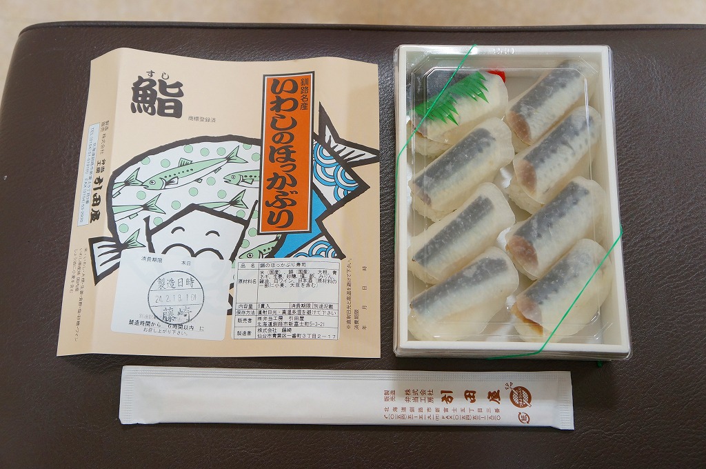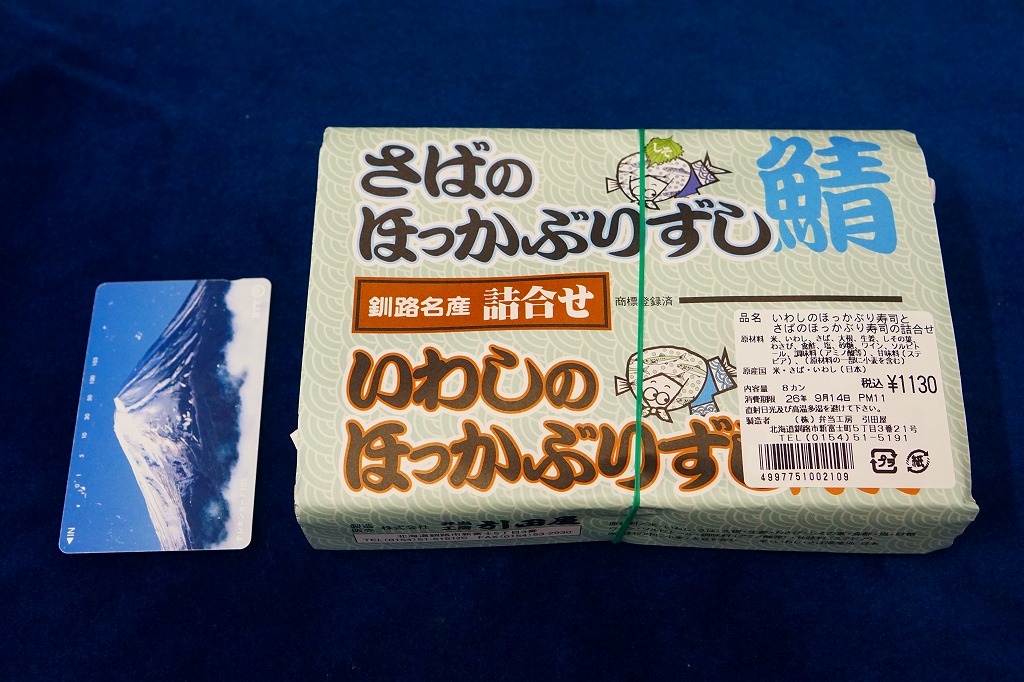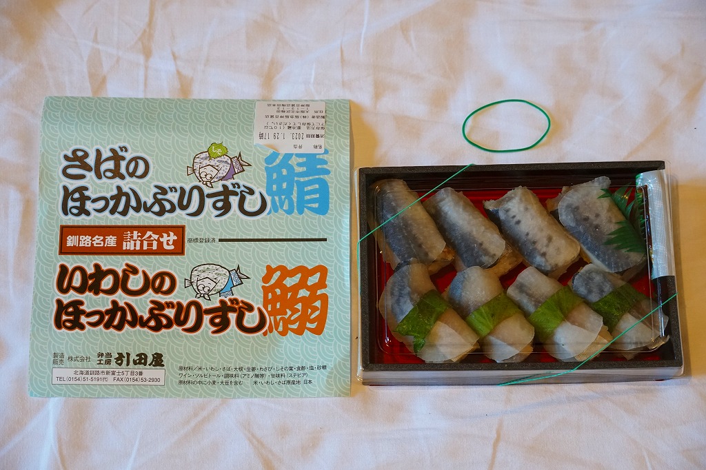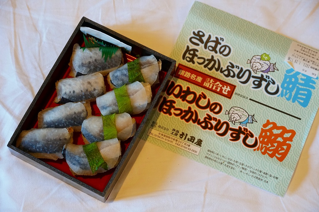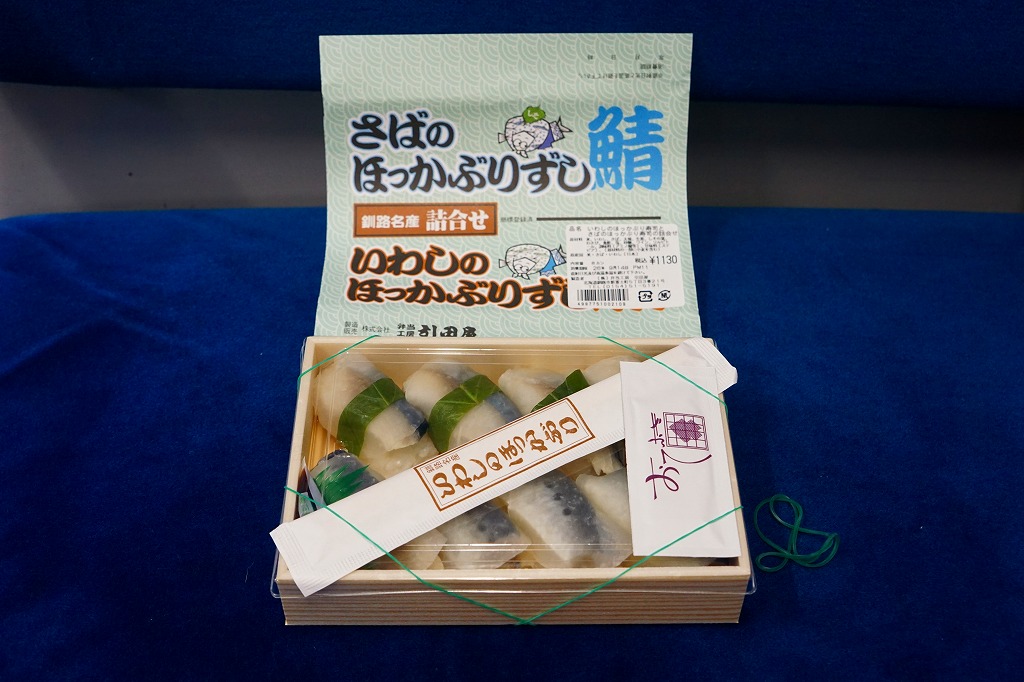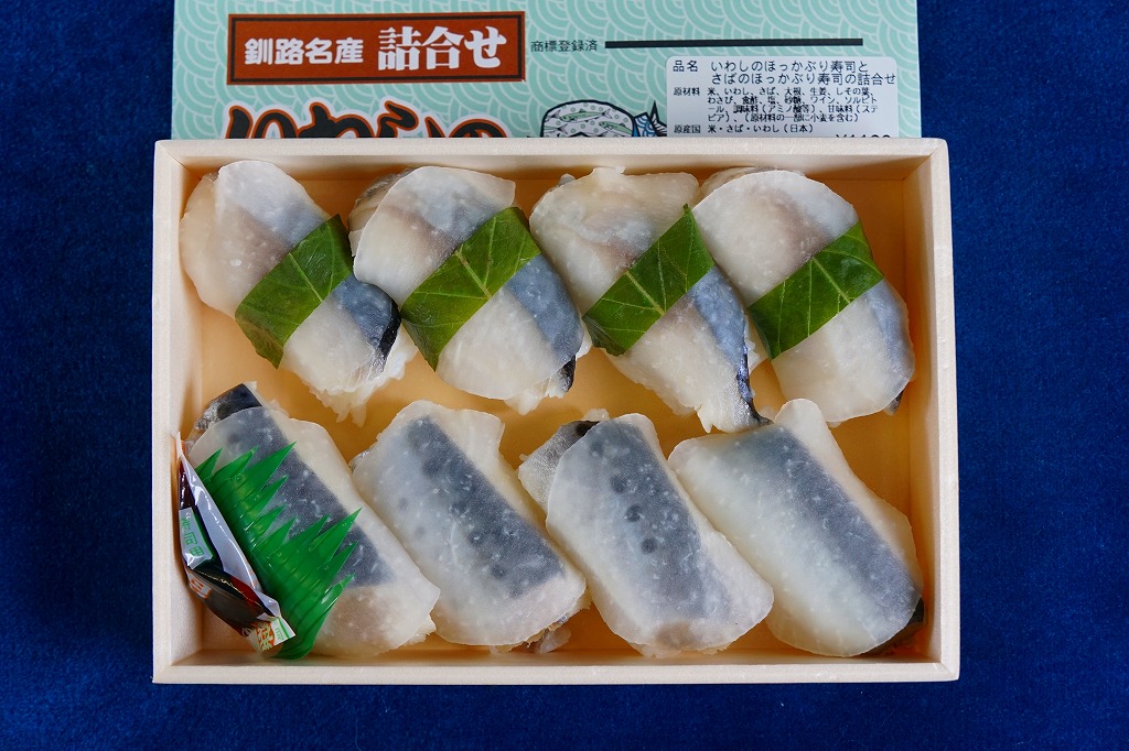 2014(平成26)年1月の京王百貨店の駅弁大会で実演販売、または2013年の秋までに釧路駅で発売か。駅弁の名前は、掛紙ではこのように定かでなく、市販の時刻表などでは「いわしとさばのほっかぶり寿司」と表記される。釧路駅の駅弁「いわしのほっかぶりずし寿司」の、8個のイワシの中身のうち4個をサバに置き換えたもの。魚の違いは分かるけれど、味はたいして違わない。価格は2014年時点で1,100円、2015年時点で1,130円、2020年時点で1,290円、2022年時点で1,350円、2025年時点で1,380円。