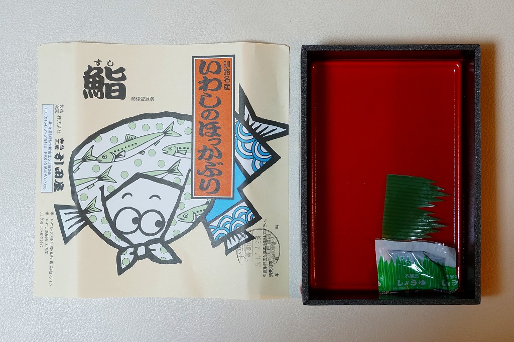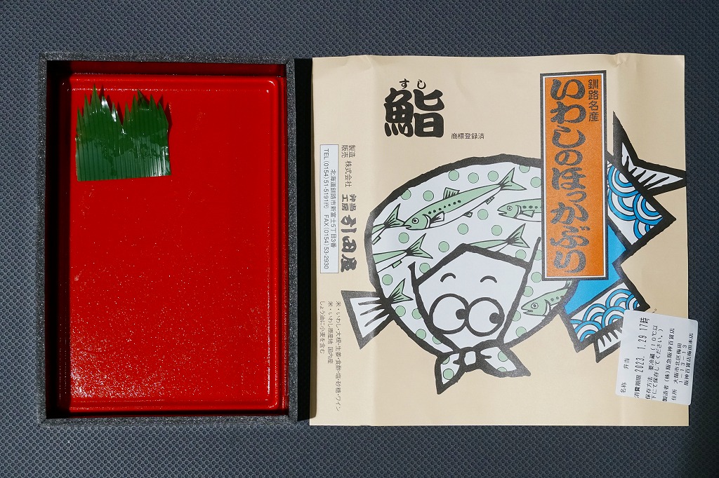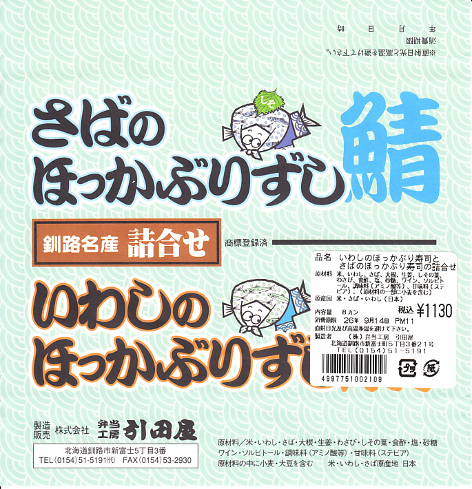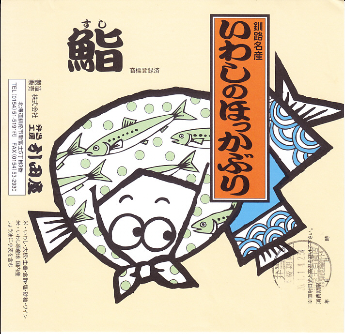 2014(平成26)年9月14日に購入した、釧路駅弁の掛紙。駅弁の名前は食品表示ラベルから。絵柄は上記の2023年のものと、まったく同じ。イワシとサバのほっかぶり寿司について当時は、あるいは現地では、通常版の「いわしのほっかぶり」とは掛紙を使い分けていた。