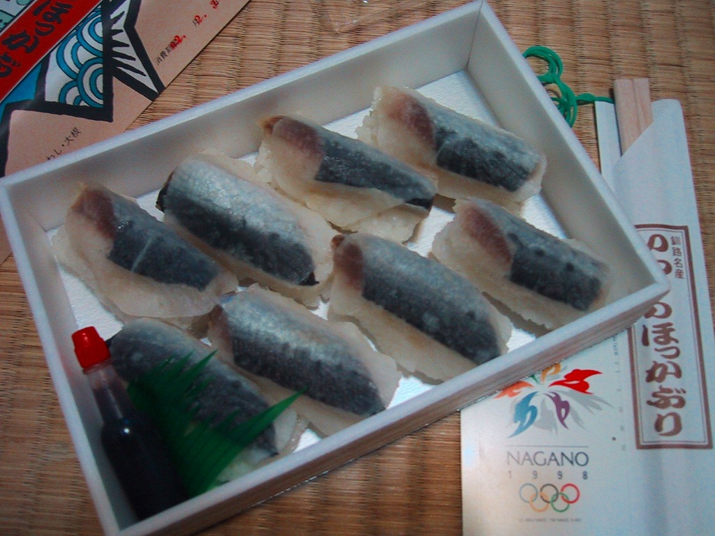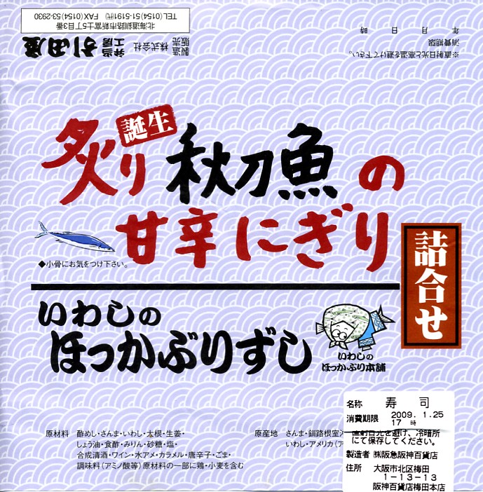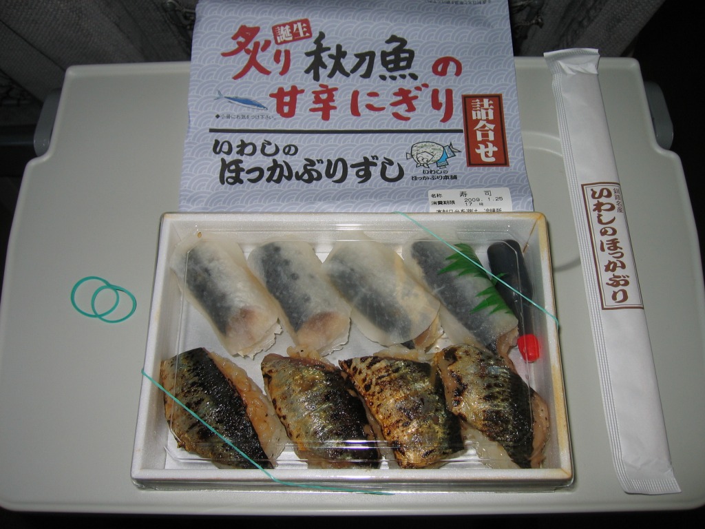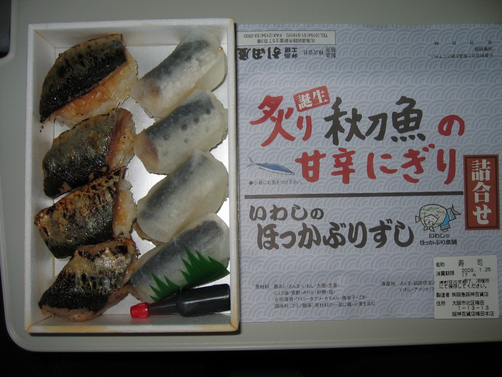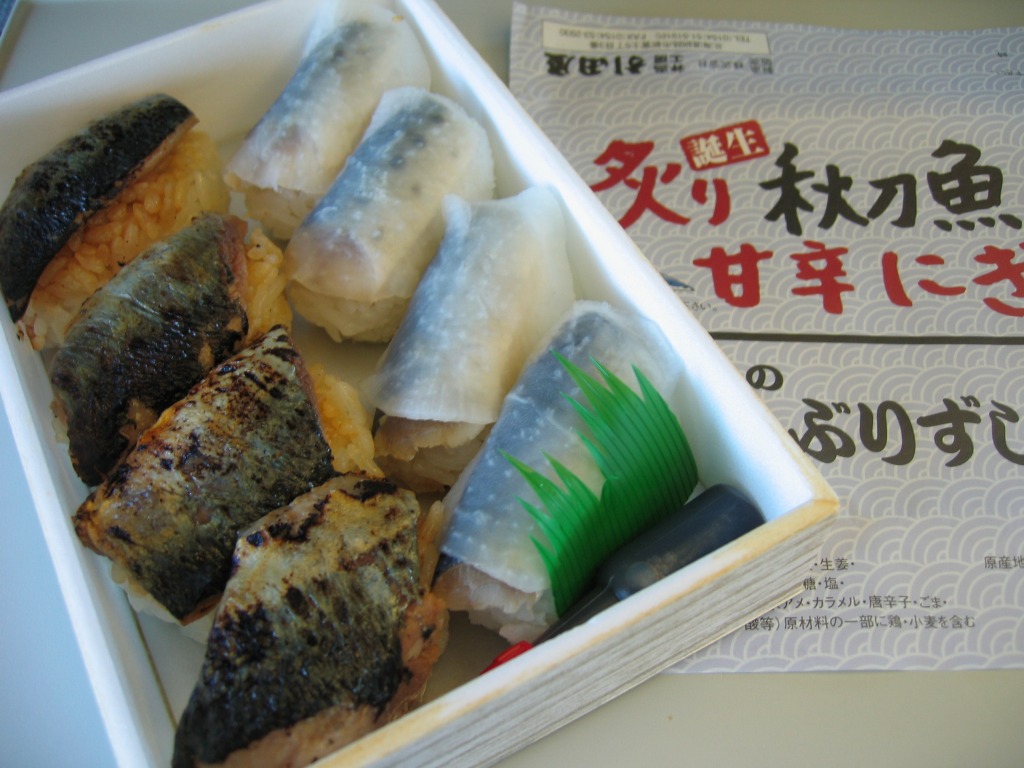 デパートでの実演販売にて上記の駅弁「いわしのほっかぶり」と併売される商品のひとつ。いわしのほっかぶりが4個、サンマをあぶった、というより焼いたものが4個、「いわしのほっかぶり」と同じ容器に入っている。けっこういい値段がするが、催事場ではちゃんと売れていた。