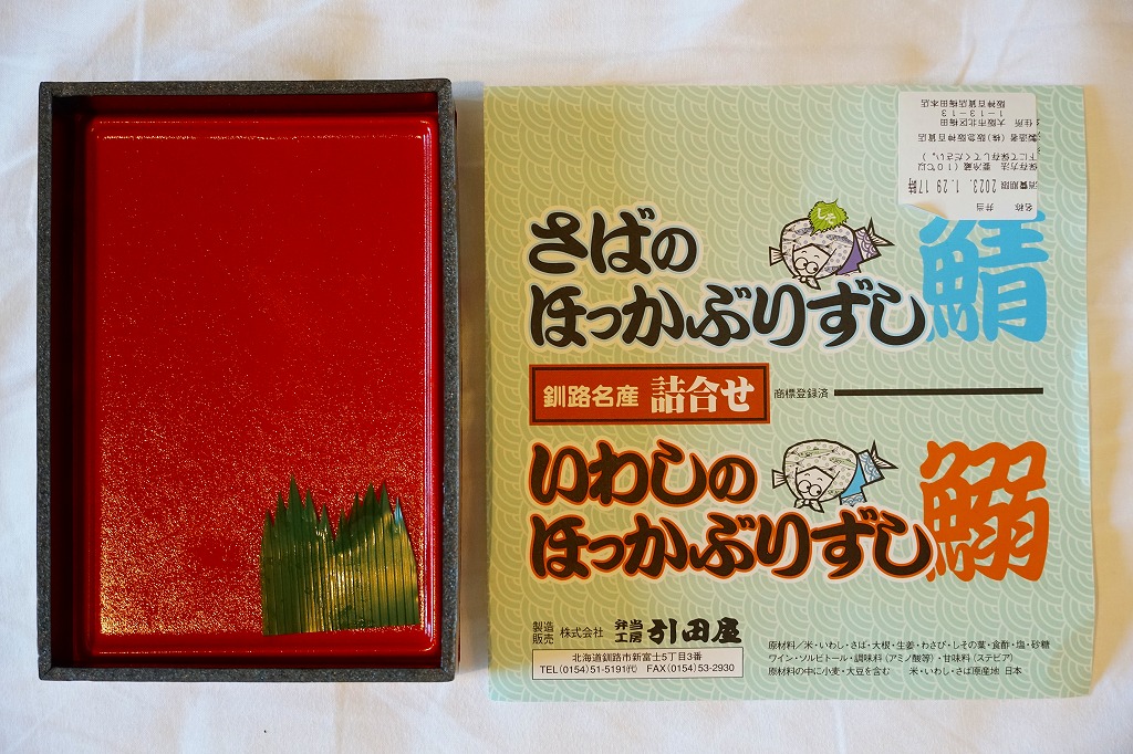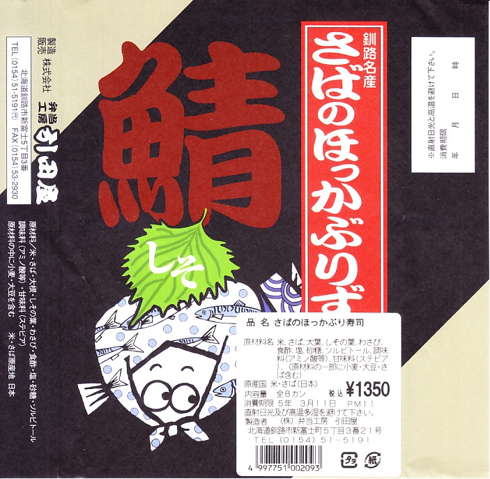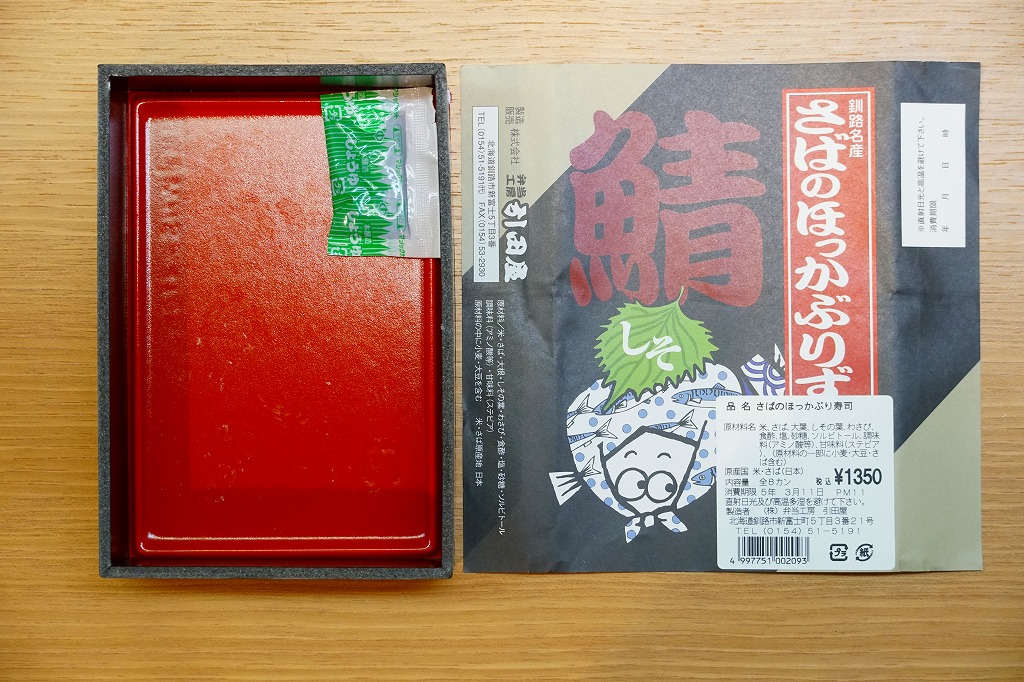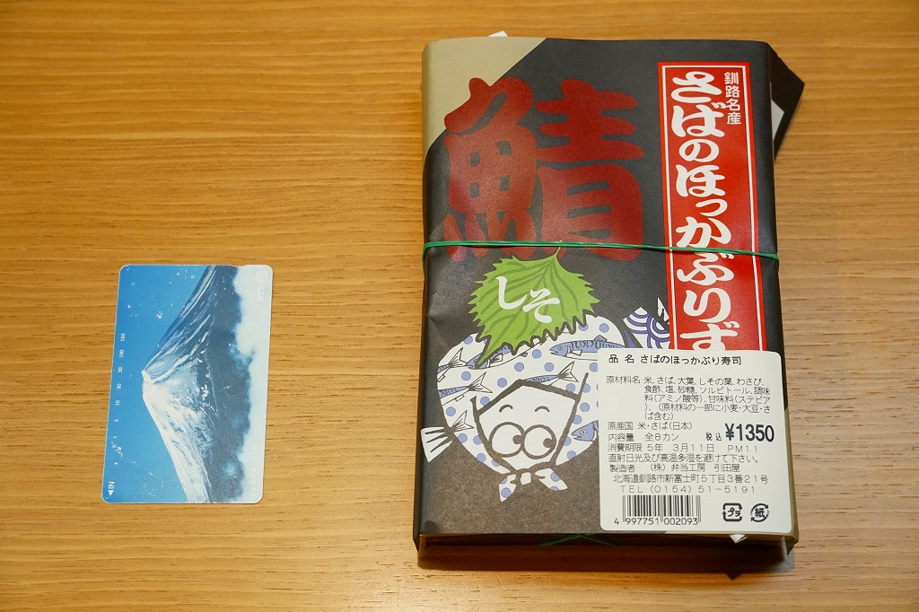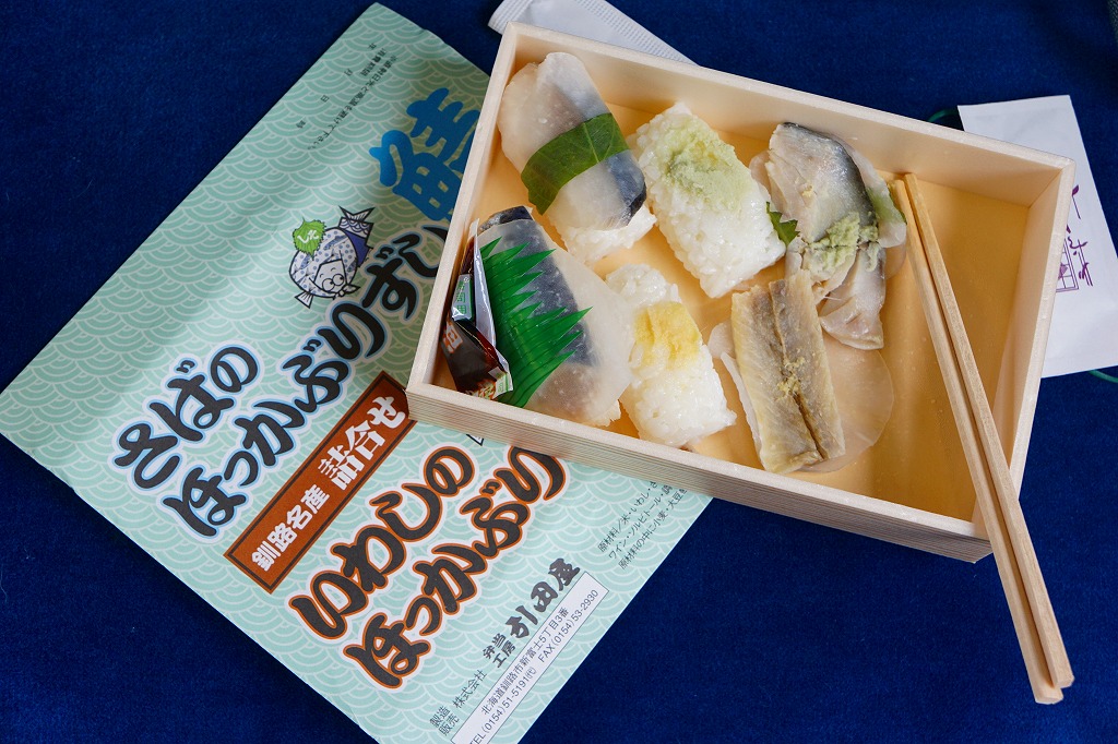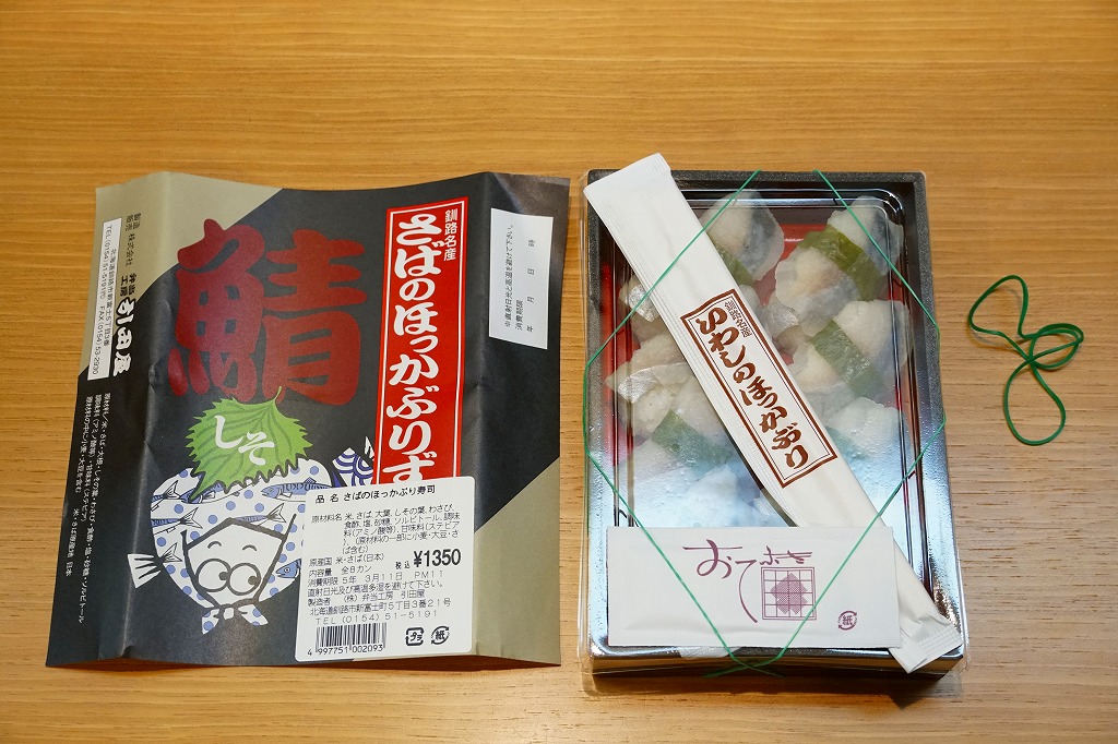 2014(平成26)年の発売か。釧路駅の駅弁「いわしのほっかぶり寿司」の、イワシをサバに置き換えたもの。酢飯の握りにサバの切り身とシソの葉と大根のスライスを貼り、大葉を巻いて留めた小さな握り寿司を8個、整然と並べて醤油を添える。葉の香りで爽やかな創作も、お値段はずいぶんと高くなったと思う。このシリーズの駅弁は釧路駅では、キヨスクでなく「釧路市水産加工業共同組合直売店」という魚介類の土産物店で売られる。価格は2014年時点で1,290円、2022年時点で1,350円、2025年時点で1,380円。