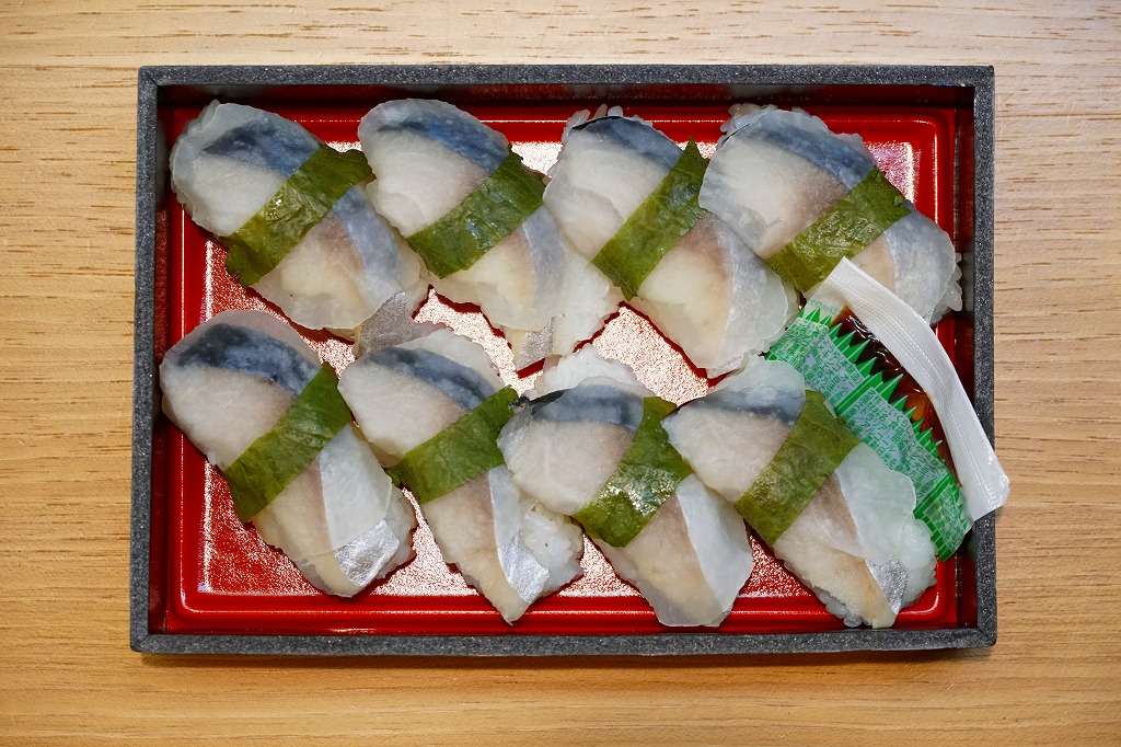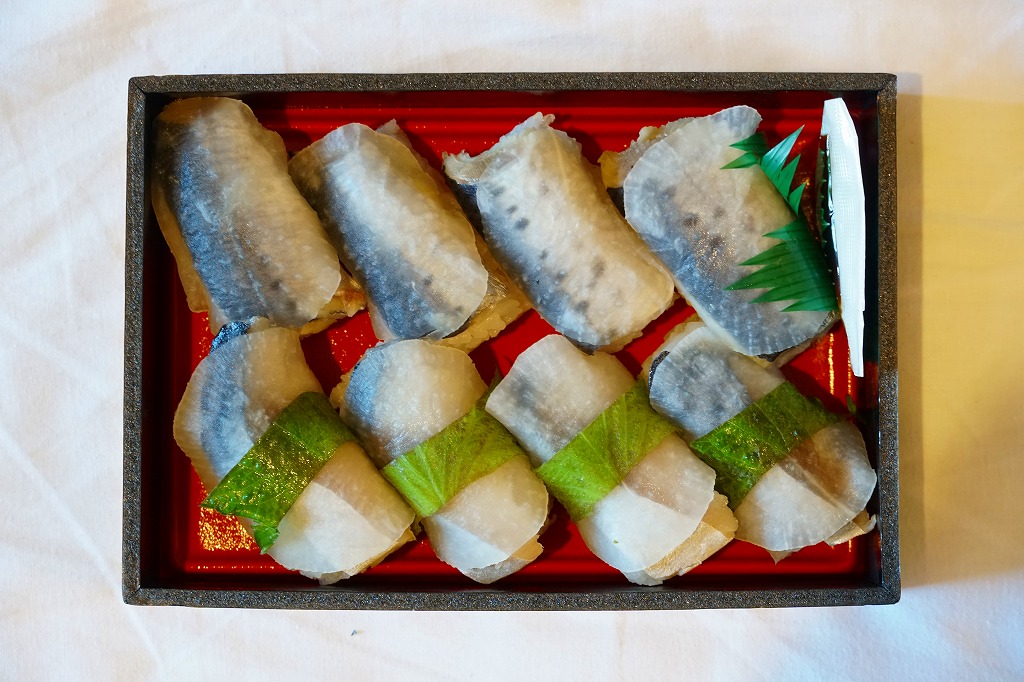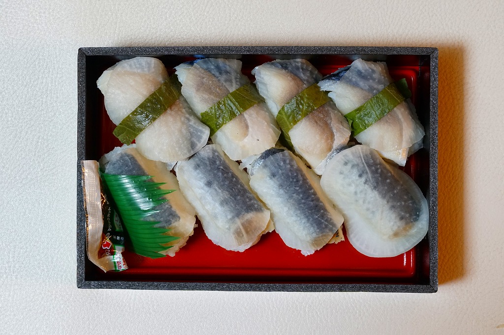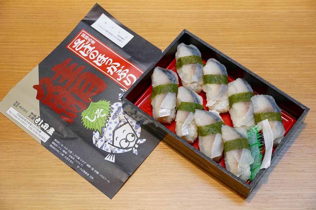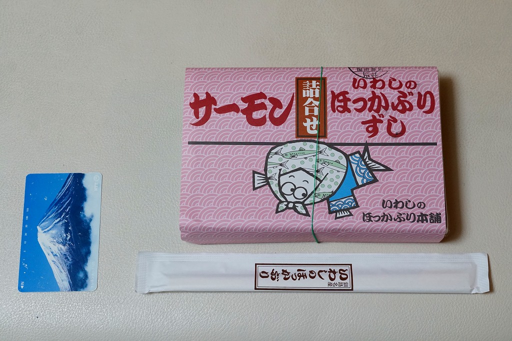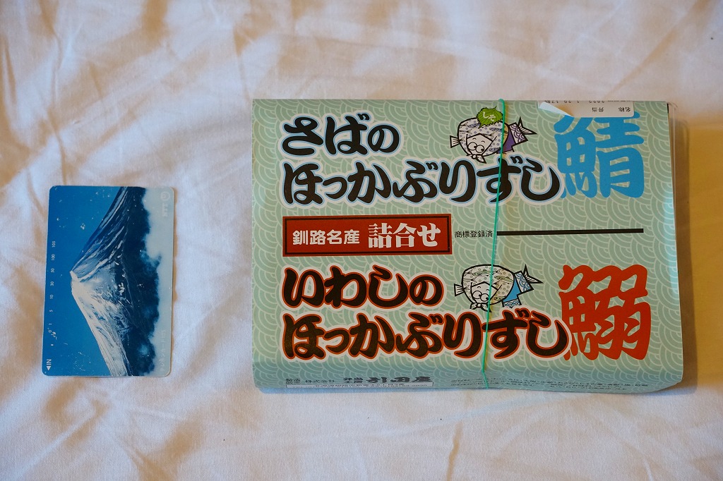 2014(平成26)年の発売か。釧路駅の駅弁「いわしのほっかぶり寿司」の、イワシをサバに置き換えたもの。酢飯の握りにサバの切り身とシソの葉と大根のスライスを貼り、大葉を巻いて留めた小さな握り寿司を8個、整然と並べて醤油を添える。葉の香りで爽やかな創作も、お値段はずいぶんと高くなったと思う。このシリーズの駅弁は釧路駅では、キヨスクでなく「釧路市水産加工業共同組合直売店」という魚介類の土産物店で売られる。価格は2014年時点で1,290円、2022年時点で1,350円、2025年時点で1,380円。