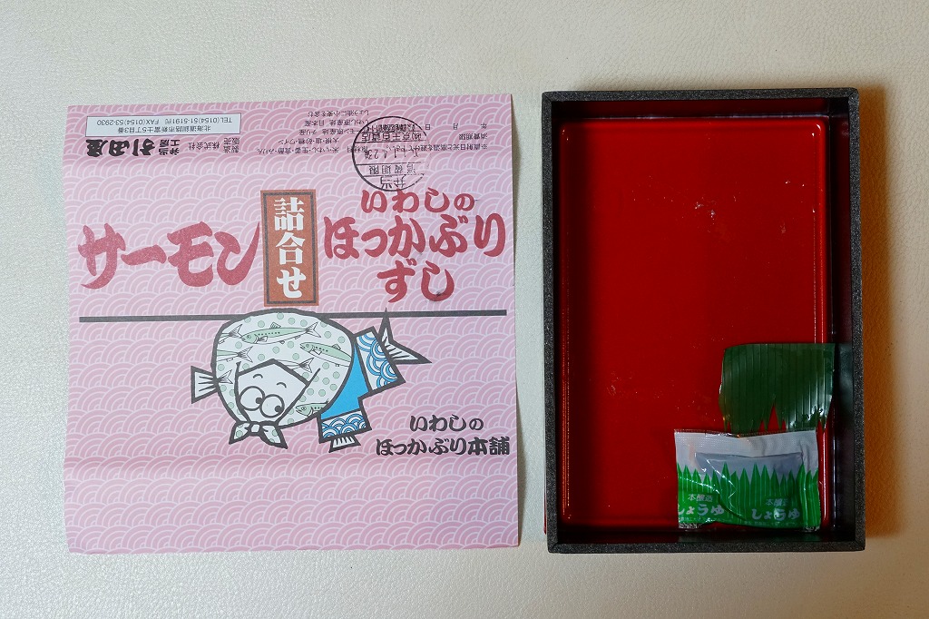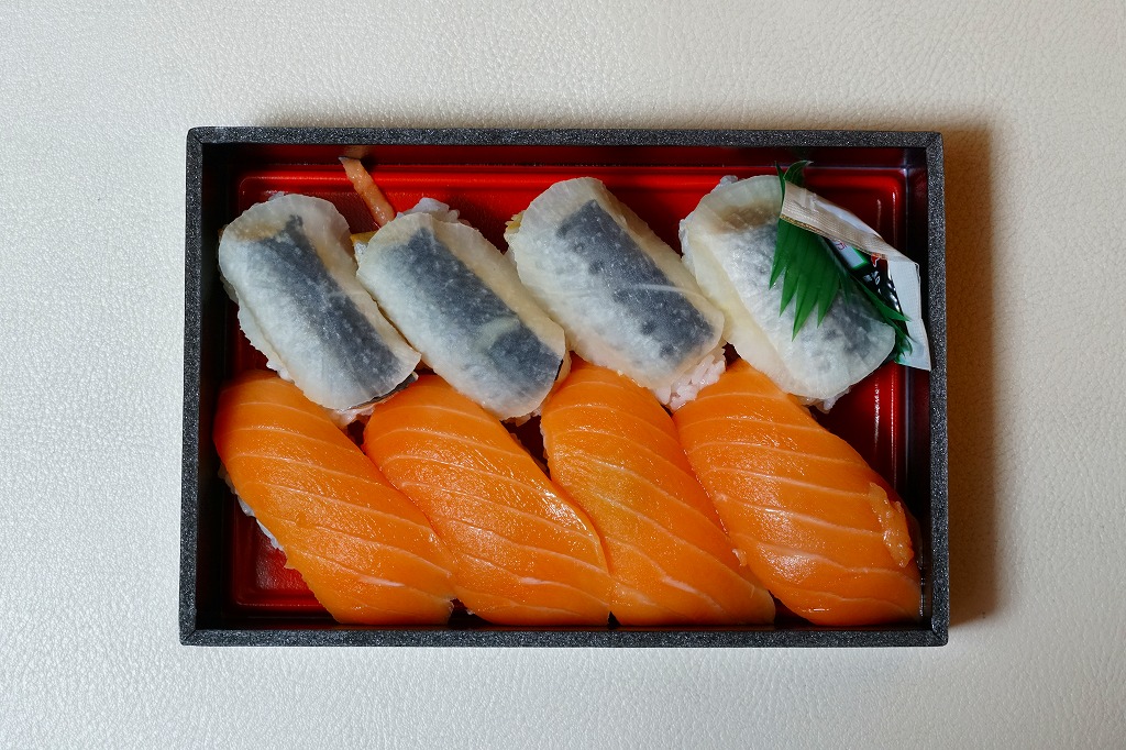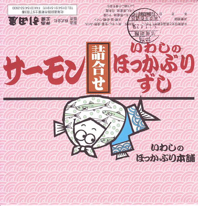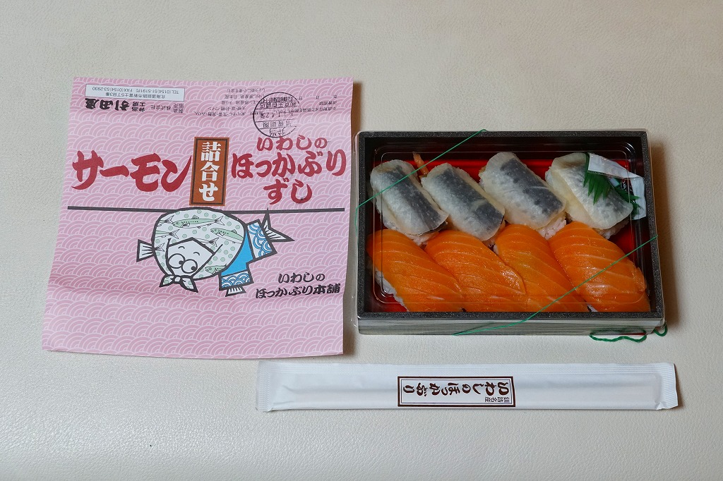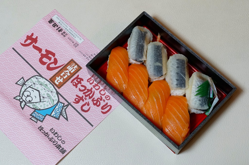 2014(平成26)年の発売か。掛紙からは駅弁の名前が読み取りにくいが、催事のチラシには「いわしのほっかぶり寿司とサーモン」とある。上記の名物駅弁「いわしのほっかぶり寿司」の、8個中4個の具を、イワシからサーモンに差し替えて、掛紙も替えたもの。平成時代にすっかりおなじみになったサーモンの握りが、なかなか酸っぱいいわしのほっかぶりと異なり、酸味を持たずに詰められていた。価格は2020年時点で1,290円、2022年時点で1,350円、2025年時点で1,380円。