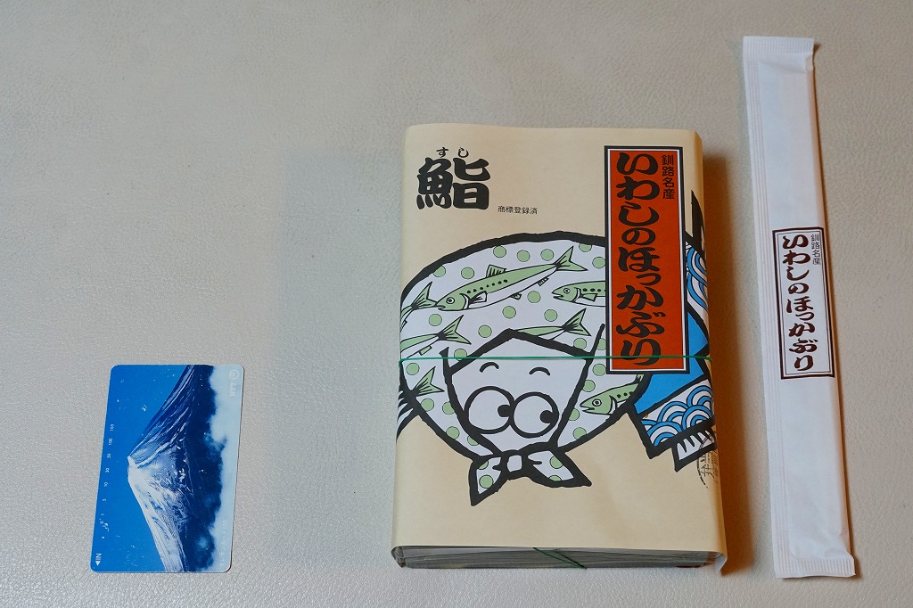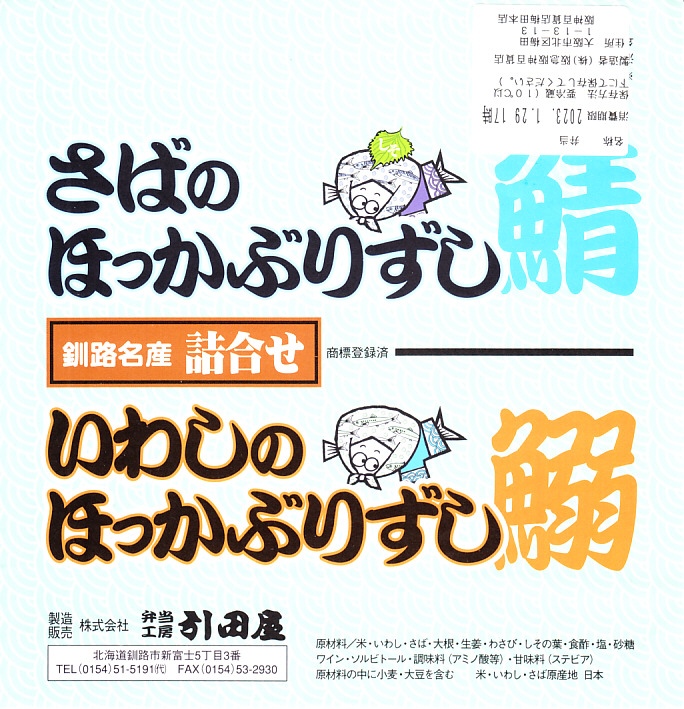 2020(令和2)年1月14日に購入した、釧路駅弁の掛紙。京王百貨店の駅弁大会で購入。中身は上記の「いわしとさばのほっかぶり寿司」。このように、実演販売では掛紙を使い分けないことがあるらしい。