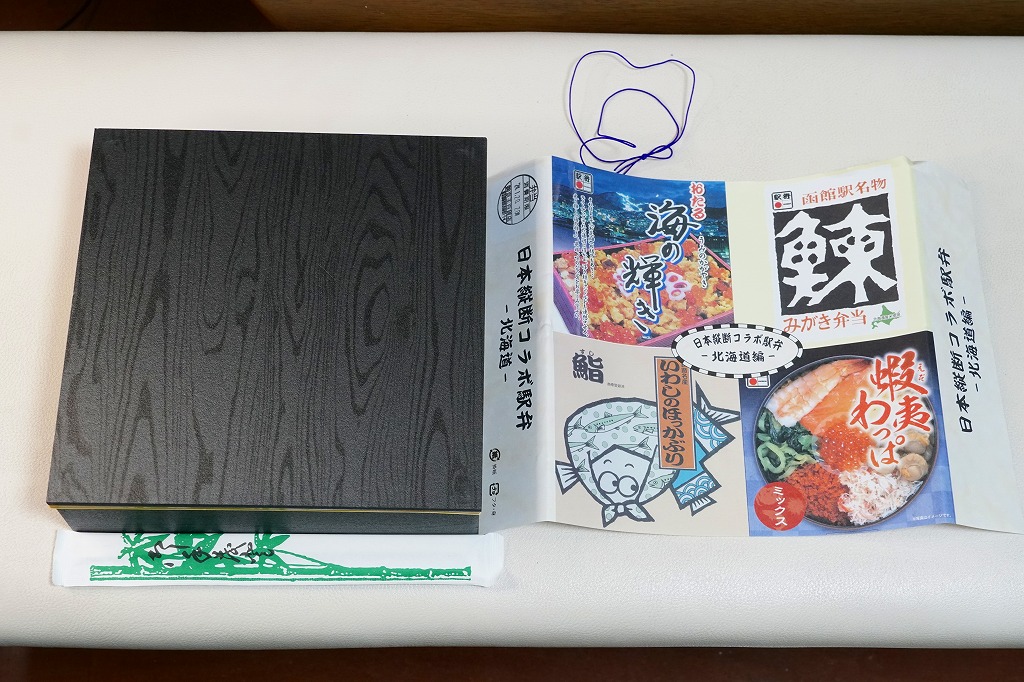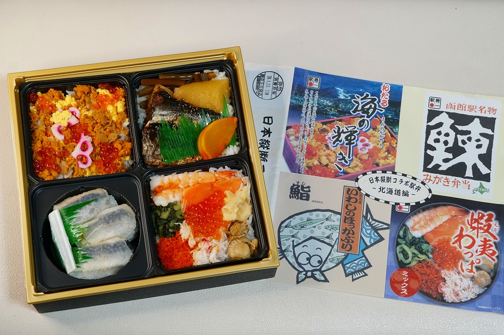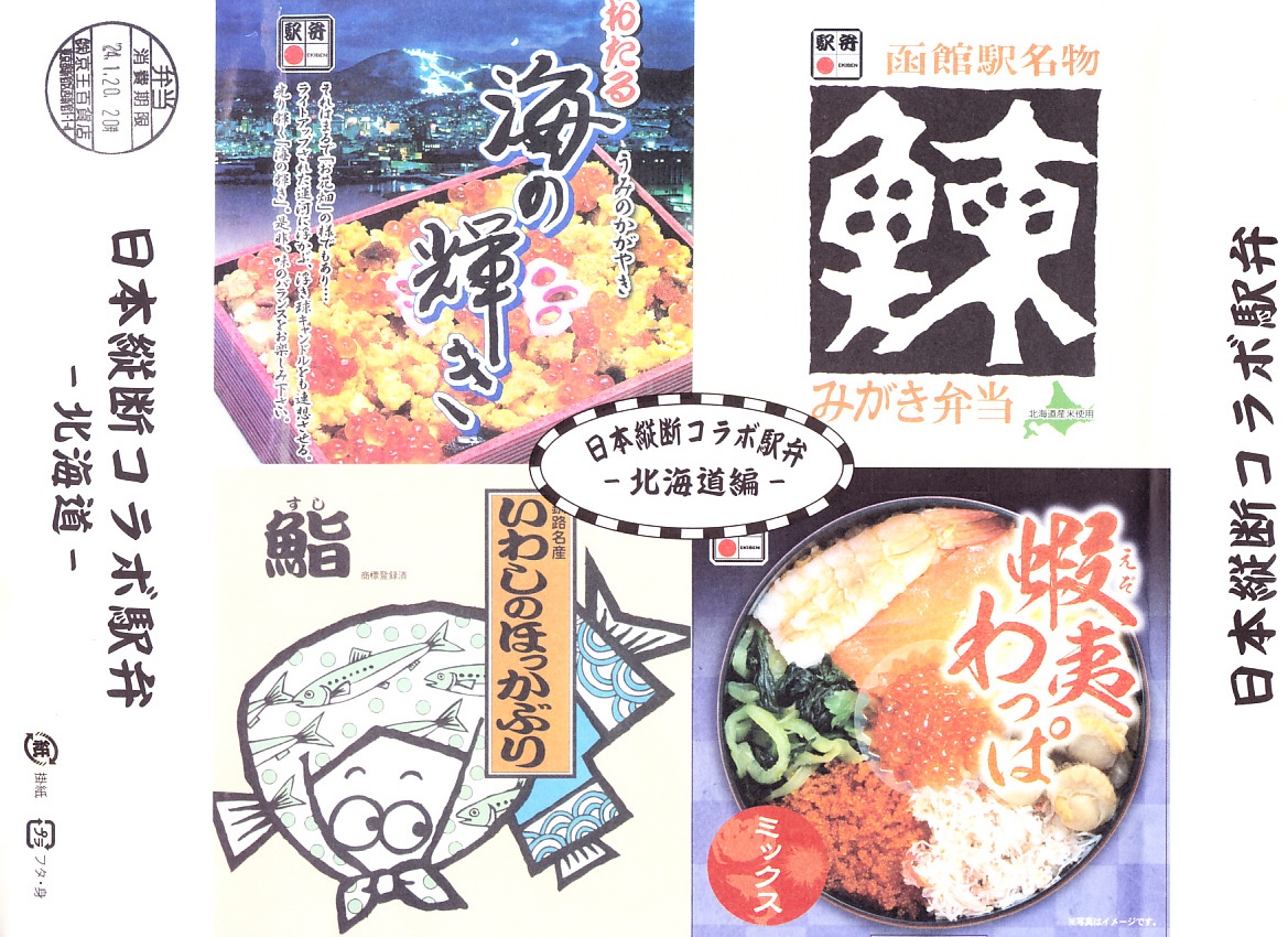 この北海道編は、小樽駅「おたる海の輝き」と、函館駅「鰊みがき弁当」と、旭川駅「蝦夷わっぱミックス」と、釧路駅「いわしのほっかぶり鮨」の詰合せ。大きな掛紙には、その4種類の駅弁の掛紙の一部や縮小版をタイル状に組み合わせた。中身も正方形の4区画で、それぞれの御飯の部分を詰合せ。味も当然に、それらと同じ。各駅弁は黒いプラ製トレーに詰めたが、いわしのほっかぶり鮨に限って丸いくぼみに収め、これに限って駅弁マークが付いていない。