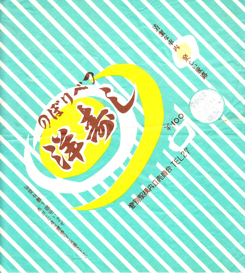 1960年代の、3月20日14時の調製と思われる、昔の登別駅弁の掛紙。当時は一日で400個や500個の洋寿しを、登別駅で販売したという。この絵柄は後の紙箱に転用され、2004年の終売まで変わらなかった。