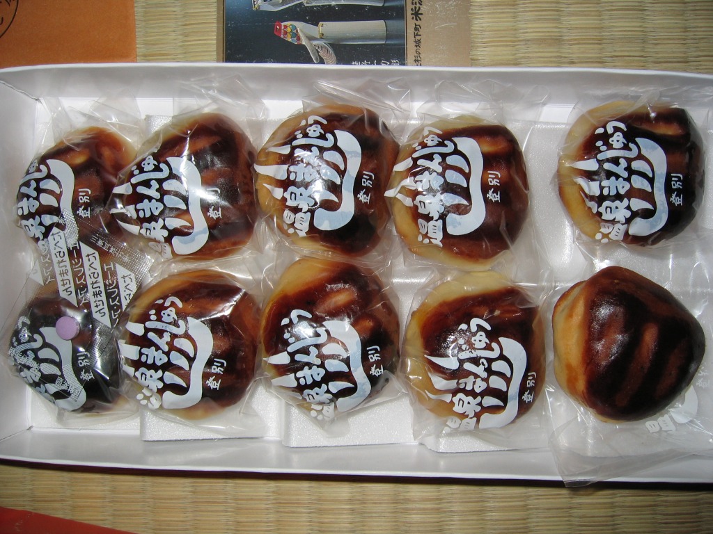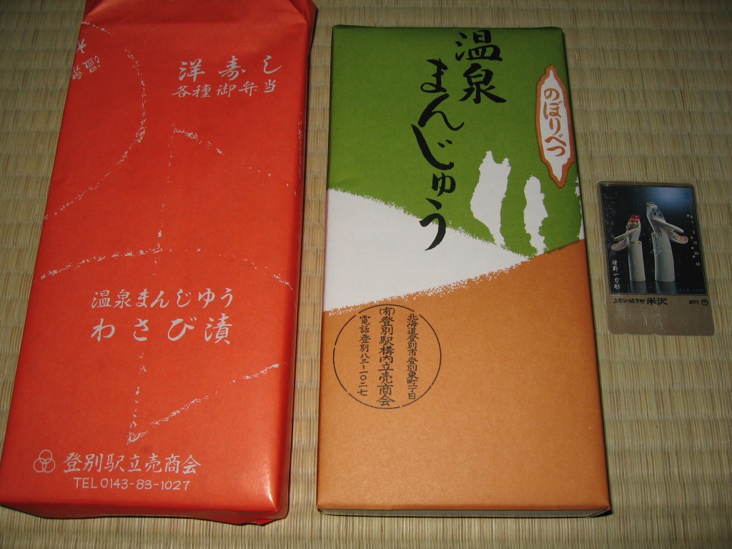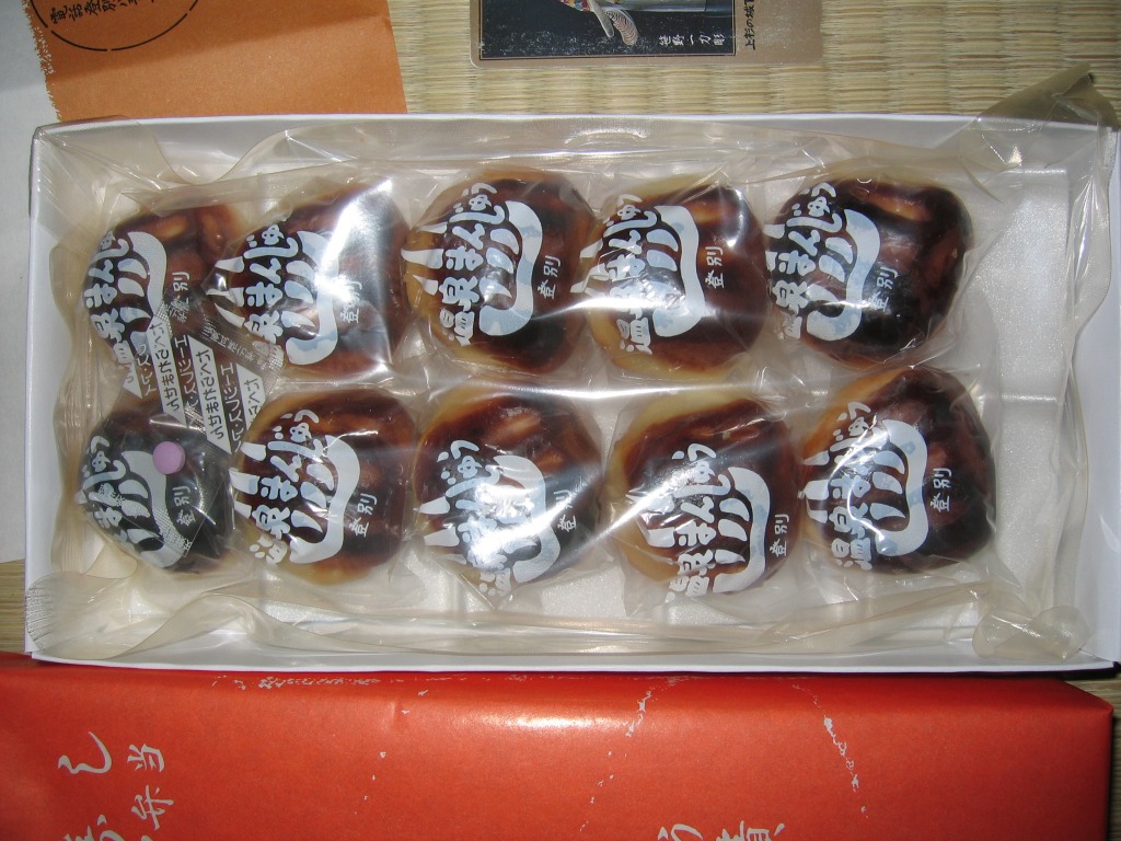 登別駅の駅弁屋の温泉饅頭。焦げていないのに濃い茶色をした栗まんじゅうが10個、個別包装でトレーに並べ、まるごと密封して箱詰めされ、商品の包装紙と駅弁屋の包装紙に包まれていた。昭和時代にはよくあったらしい、駅弁屋の甘味や饅頭も、21世紀には数少ないもの。