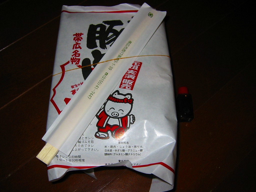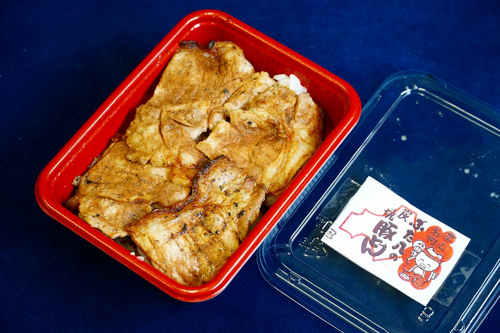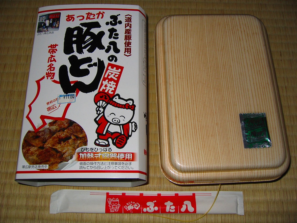 帯広駅の名物駅弁。御飯の上にタレを付けた豚炭火焼肉をたっぷり載せるシンプルなもの。写真は池袋西武百貨店の実演販売で購入したもので、現地版は加熱機能付き容器を使用し、掛紙のデザインが少々異なる模様。2020年時点で帯広駅にこれと同じものはないが、中身が同じものは小、並、大を取り揃える。