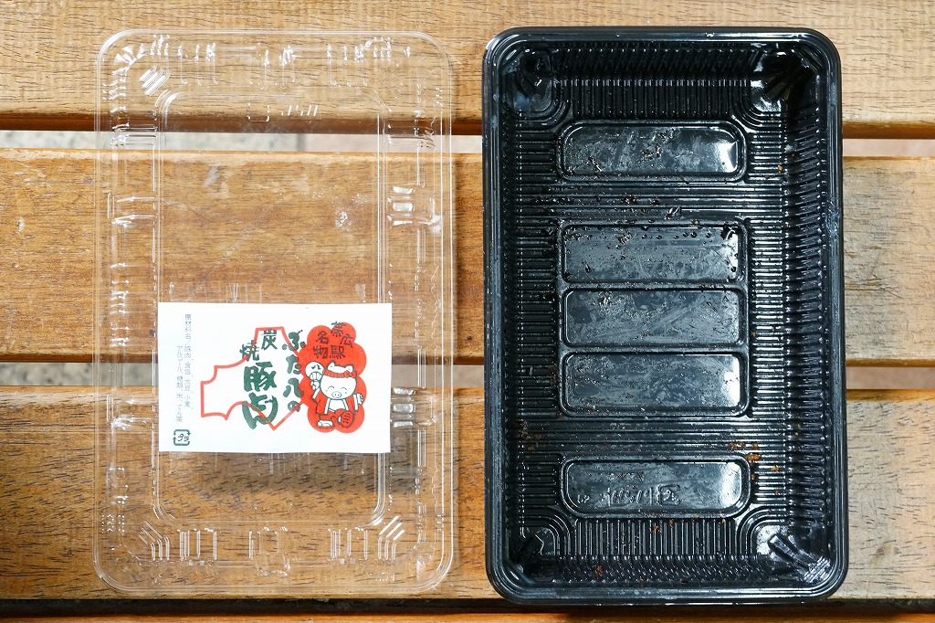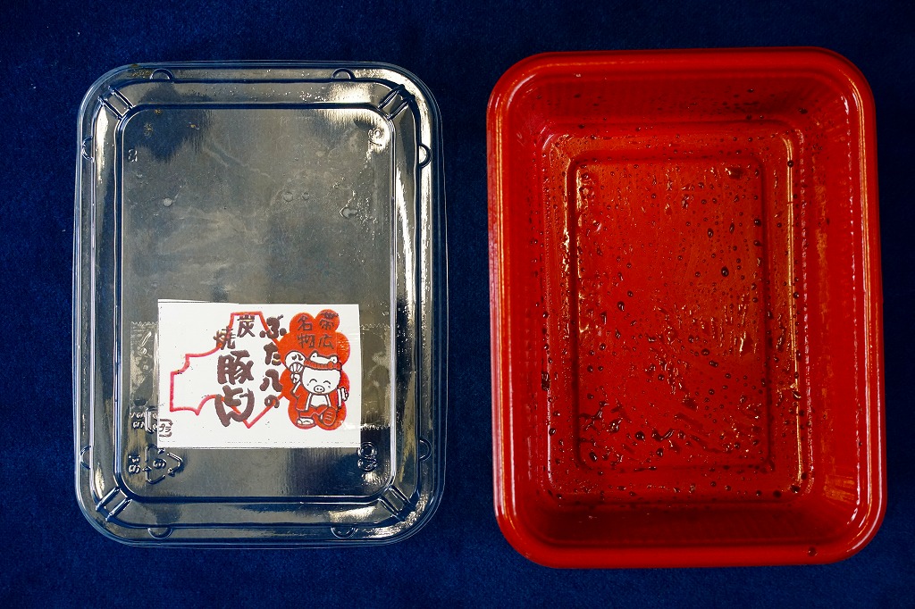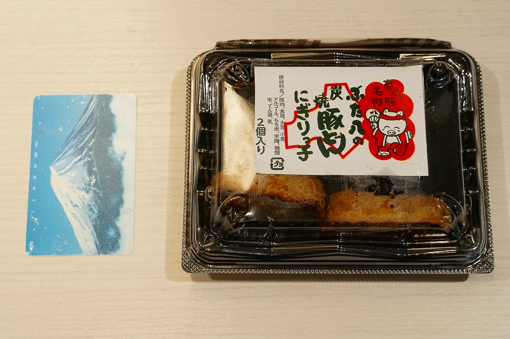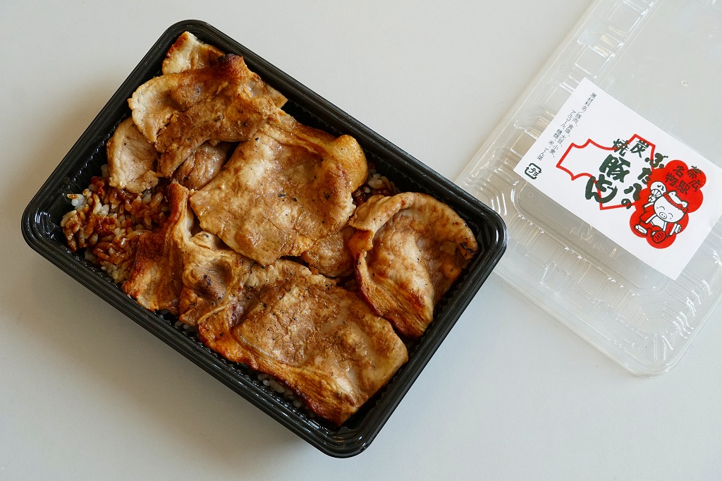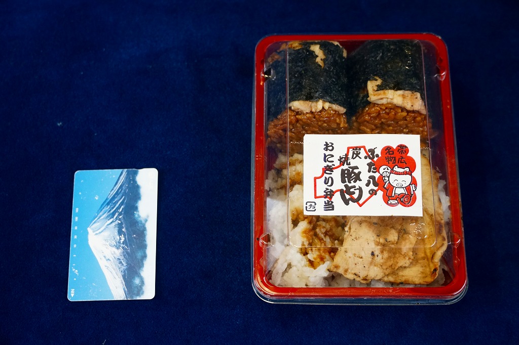 上記の駅弁「ぶた八の炭焼豚どんにぎりっ子」の、2020(令和2)年時点での姿。紙片の絵柄と焼き豚の形状が、上記の2025年のものや、下記の2010年のものと、明らかに異なる。味も豚肉の形の影響で、異なる印象を受けた。