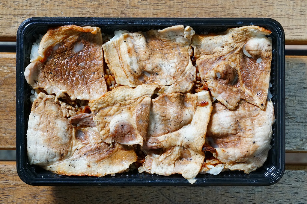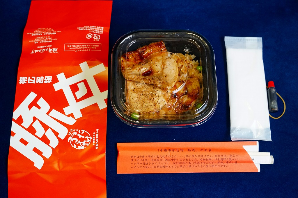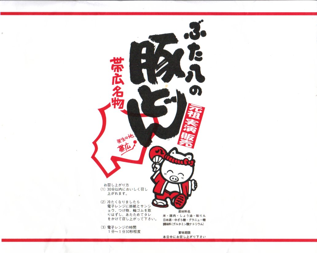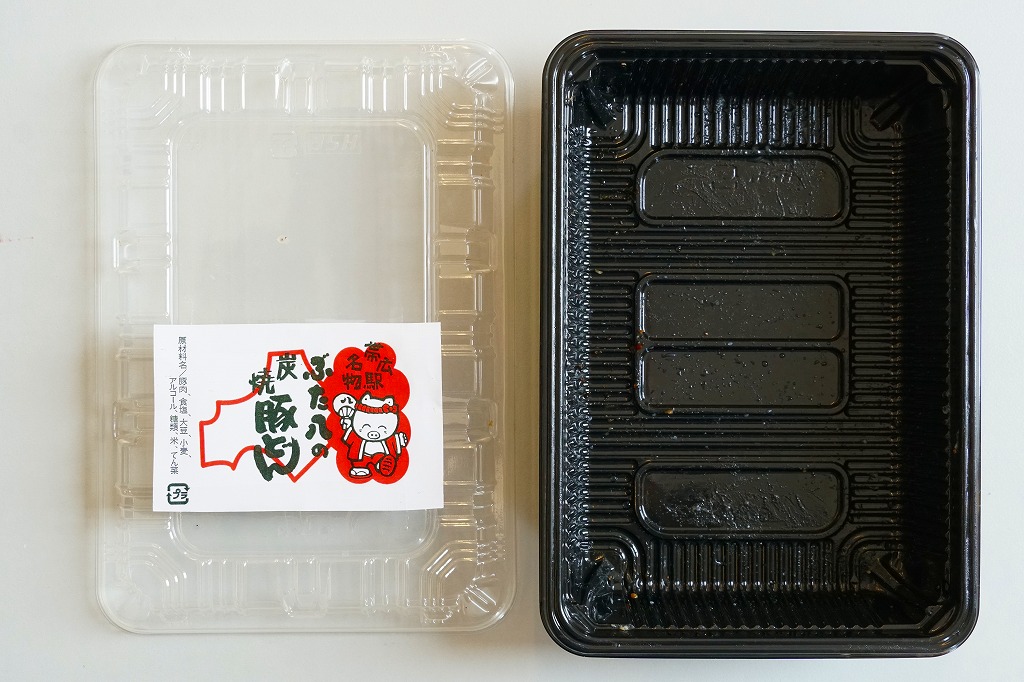 丼もの向けの容器に、白飯を詰めてタレをかけ、豚焼肉を置いてグリーンピースで彩る。注文販売なので、出来立てでホカホカなので、味は柔らか。商品名をしっかり書いた掛紙を巻いていて、今の帯広駅弁より駅弁らしく見えた。これは「2枚」で750円。他に「4枚」1,040円と「6枚」1,430円があり、御飯と肉が増えるらしい。