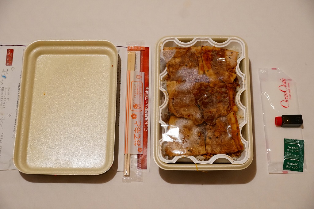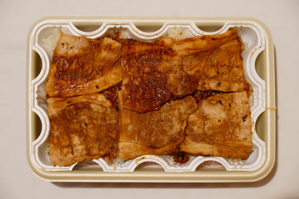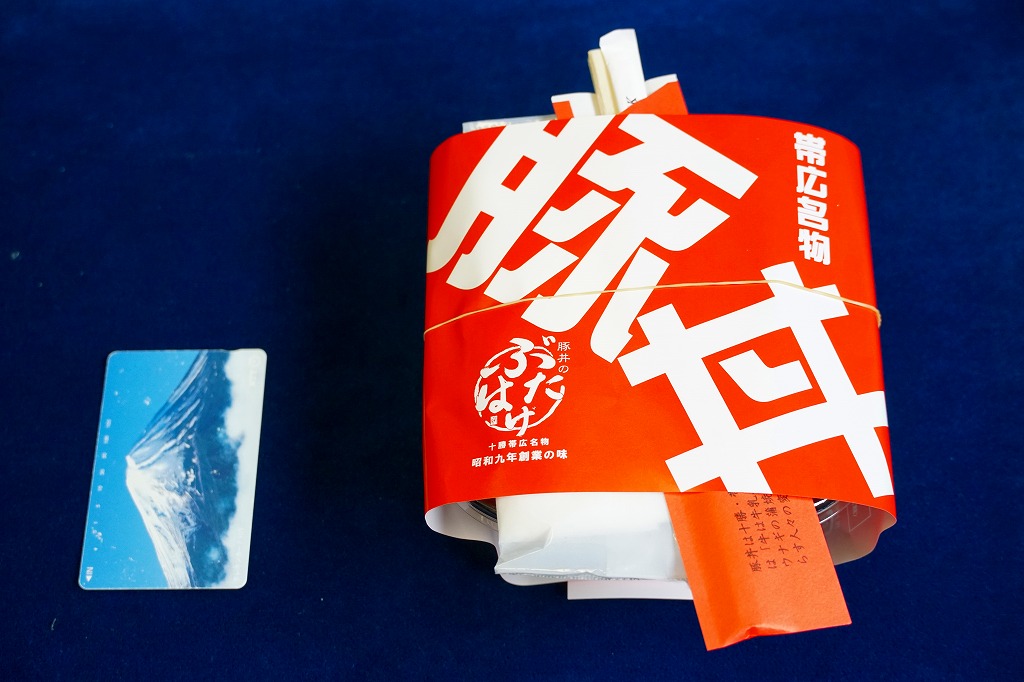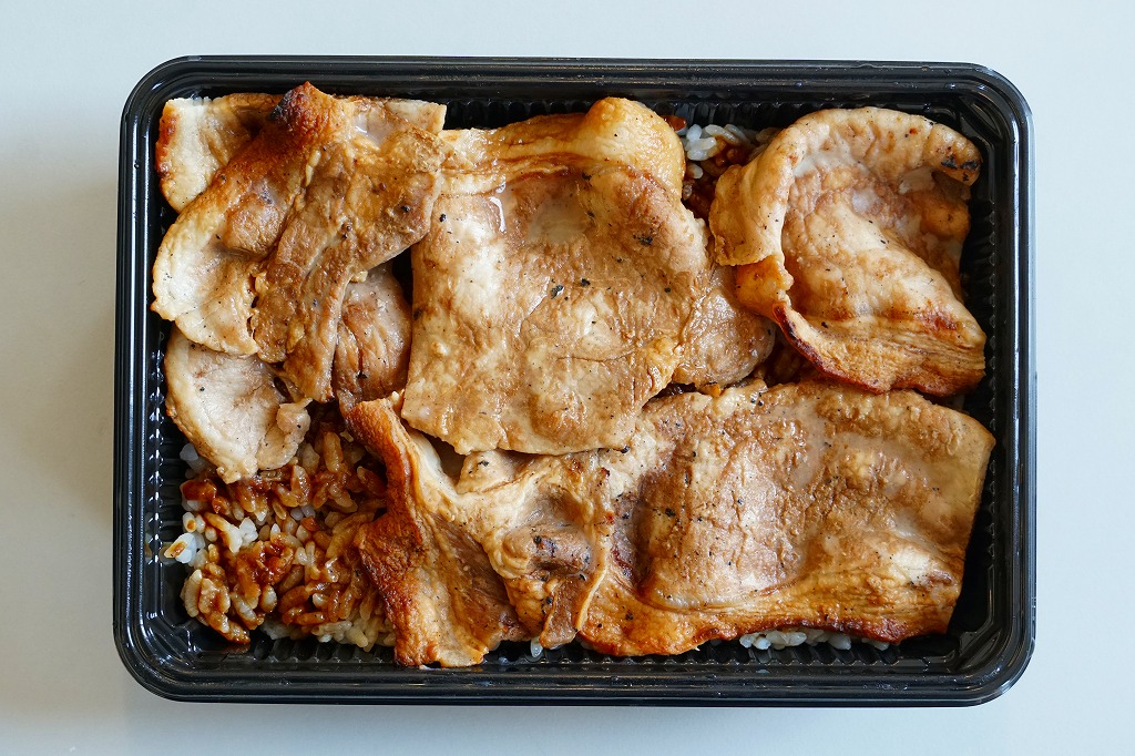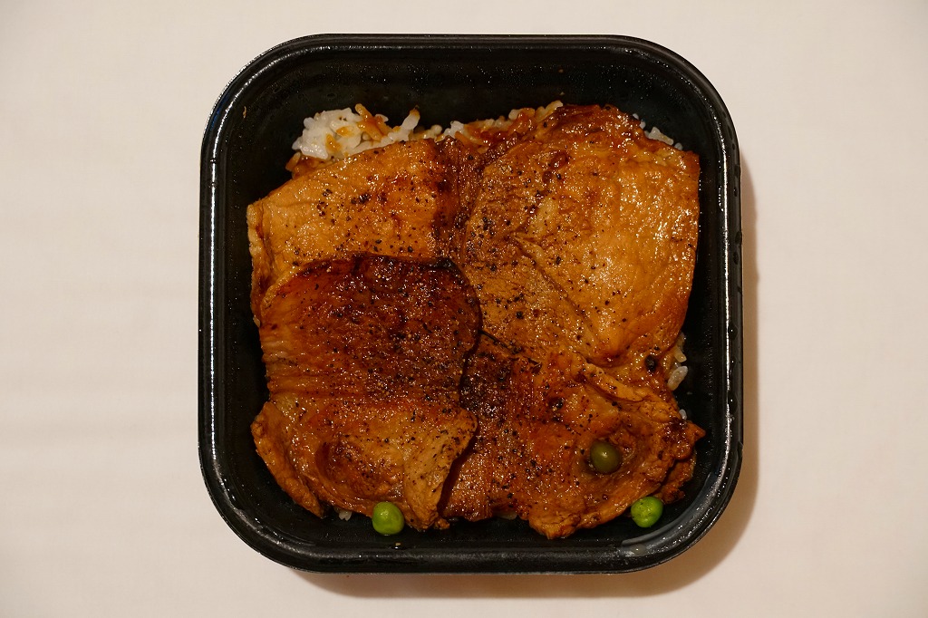 丼もの向けの容器に、白飯を詰めてタレをかけ、豚焼肉を置いてグリーンピースで彩る。注文販売なので、出来立てでホカホカなので、味は柔らか。商品名をしっかり書いた掛紙を巻いていて、今の帯広駅弁より駅弁らしく見えた。これは「2枚」で750円。他に「4枚」1,040円と「6枚」1,430円があり、御飯と肉が増えるらしい。
