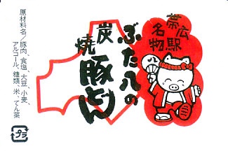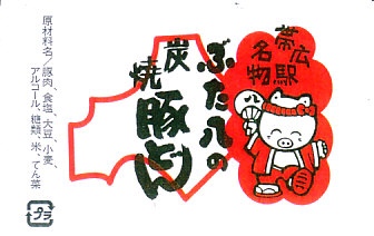 上記の駅弁「ぶた八の炭焼豚どん」の「並」サイズ。値段と大きさを除き、「小」のものと変わらない。紙片の絵柄も、調製元の表記がないことも、まったく同じ。