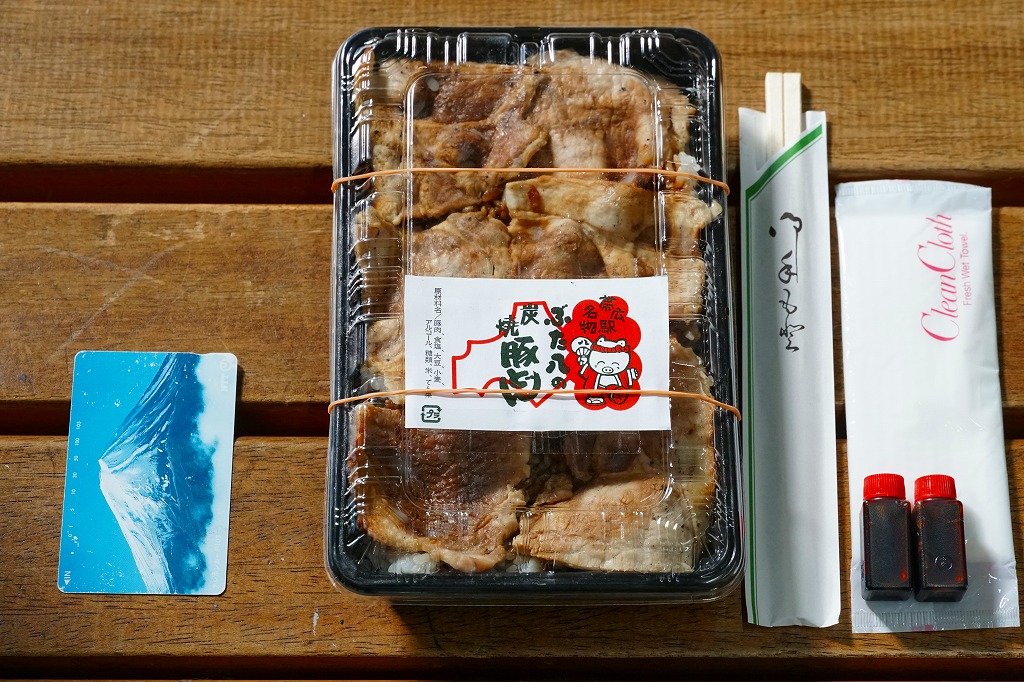 上記の駅弁「ぶた八の炭焼豚どん」の「大」サイズ。値段と大きさを除き、「小」のものと変わらない。紙片の絵柄も、調製元の表記がないことも、まったく同じ。