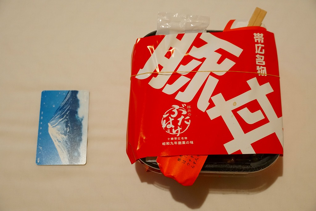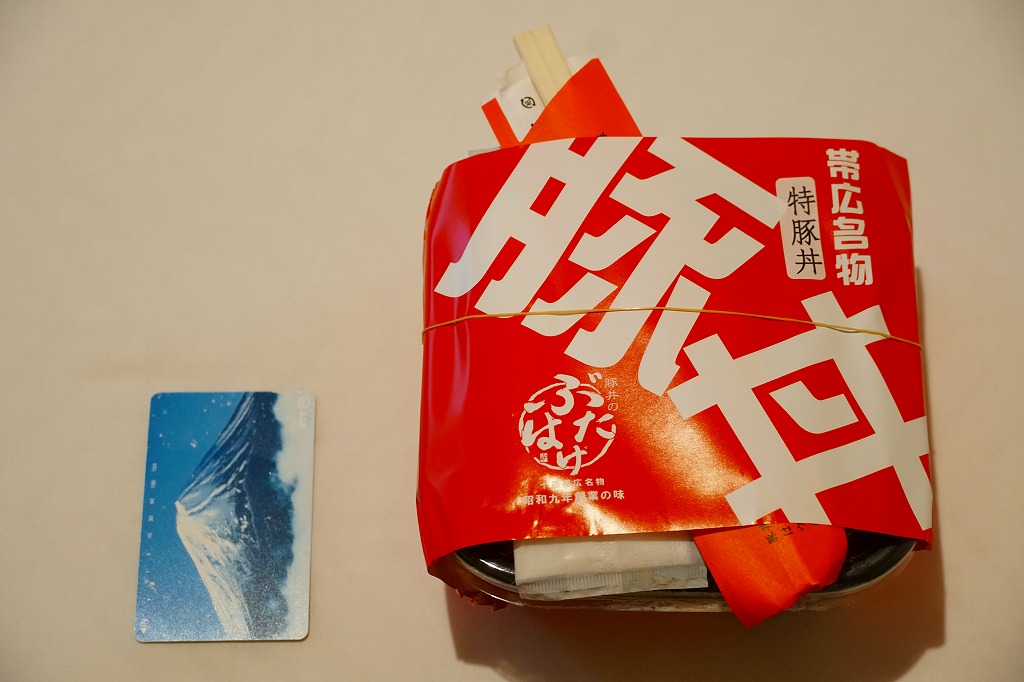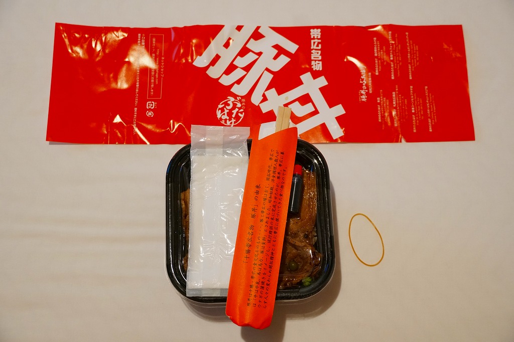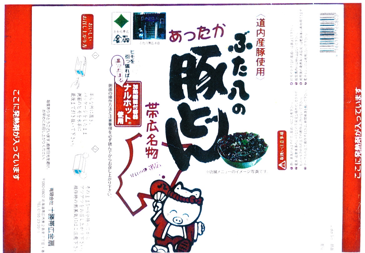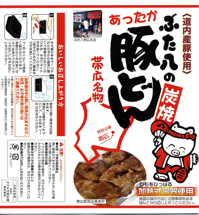 帯広駅の名物駅弁の、加熱機能付き容器版。長方形の加熱機能付き容器に、カラーコピーがかすれた掛紙を巻く。2020年までにはスリーブがこの掛紙に替わったらしい。中身も同じ、帯広名物の豚丼。冷めても悪くないと思うが、やはり暖まったほうがうまい料理だと思う。価格は2006年時点で1,100円、2012年時点で1,200円、2022年時点で1,300円、2023年時点で1,400円。