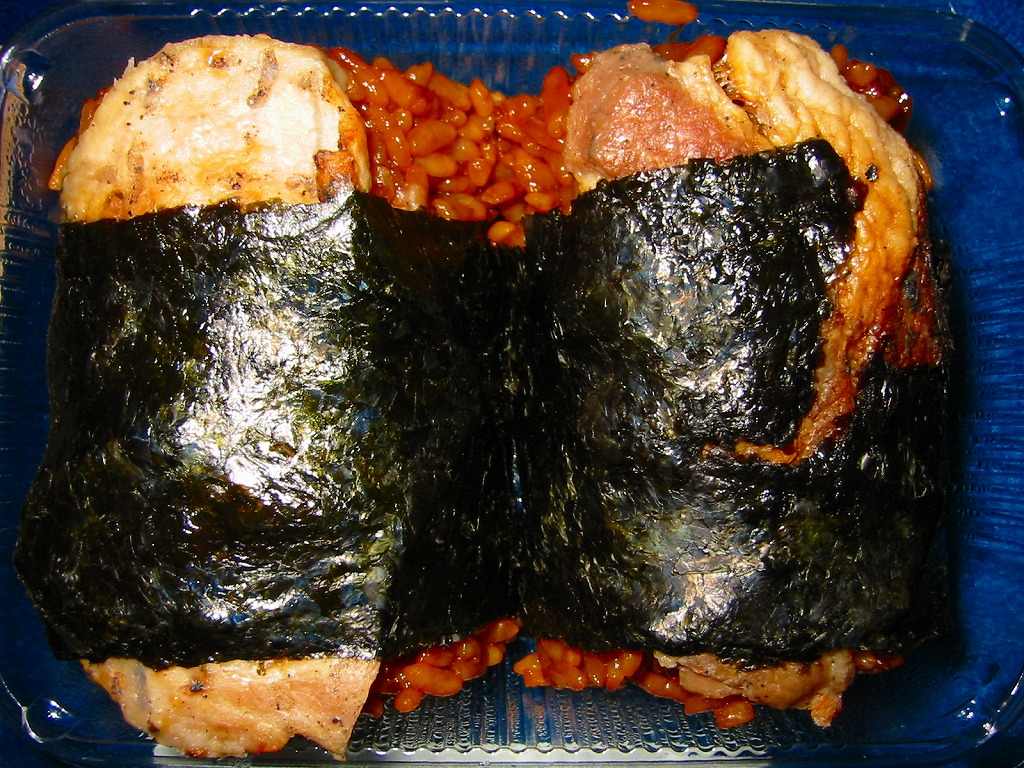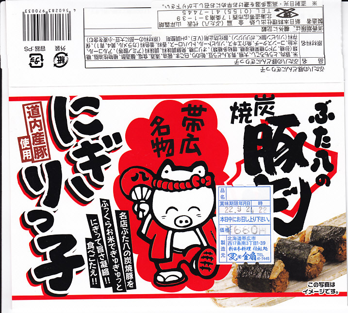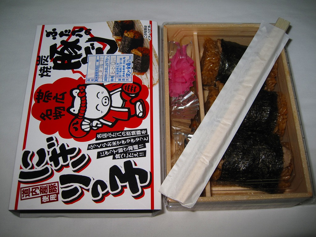 中身はタレ御飯に焼き豚を貼り付けて海苔で巻いたものが2個。この内容は見栄えの変遷があれど、2000年代から変わらない、豚丼の俵飯。常温で飯も肉も締まりのある、あるいは固くなった、腹持ちする軽食。調製元は現物に記載がないが、帯広駅でこれを売る屋台に「金扇」(きんせん)と書いてあり、これが調製元であり販売元である模様。価格は長らく400円、2020年時点で450円、2022年時点で500円、2025年時点で600円。