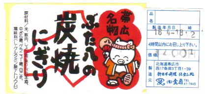 上記の「ぶた八の炭焼豚どんにぎりっ子」の、2010(平成22)年時点での姿。当時は帯広駅のコンビニキヨスクで売られ、商品名と調製元のシールが貼られていた。また、キヨスクの隣に調製元の食堂があったと思う。