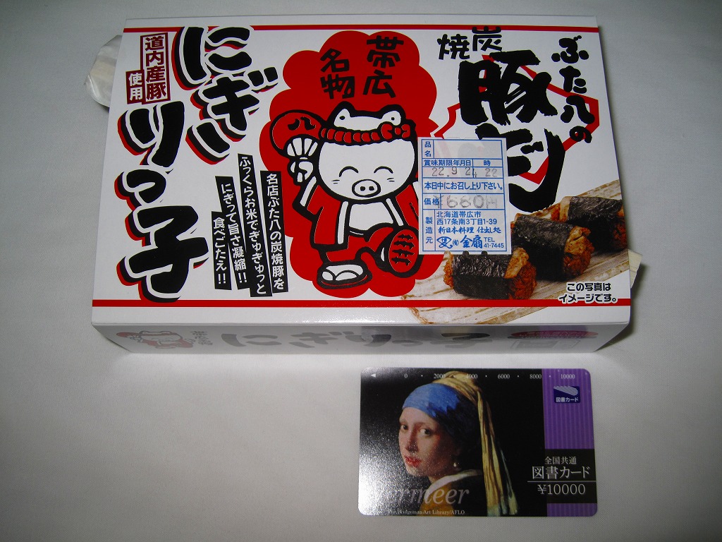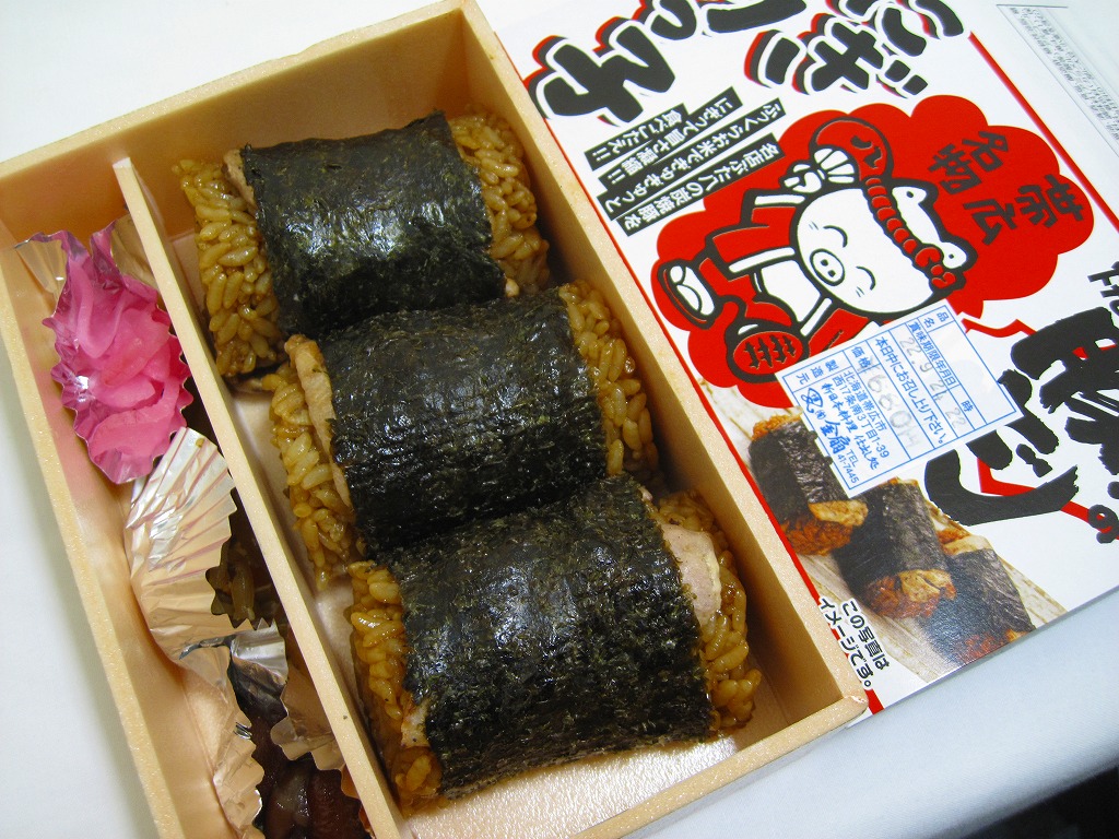 帯広駅の名物駅弁「ぶた八の豚どん」が、3個の握り飯になったもの。小柄な容器を、中身のイメージ写真や商品名や豚のイラストなどを描いたボール紙の枠にはめる。中身はタレに染まる御飯に豚焼肉を合わせて海苔で巻いた俵飯が3個と、煮豆、レンコン煮、大根桜漬。つまり「ぶた八の豚どん」を大きな俵飯にしたもの。やはりなかなか、濃厚な味。2020年時点で現存しない模様。