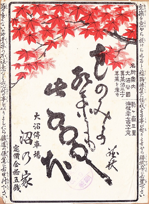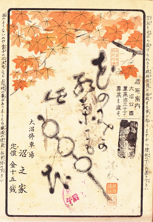 第二次大戦前のものと思われる、大沼だんごの掛紙。絵柄は21世紀の現在のものと同じに見えて、よくよく見比べると筆跡が微妙に異なる。現在の大沼公園駅は、1924(大正11)年11月から1964(昭和39)年4月まで大沼駅を名乗り、その間に現在の大沼駅は軍川(いくさがわ)駅であった。